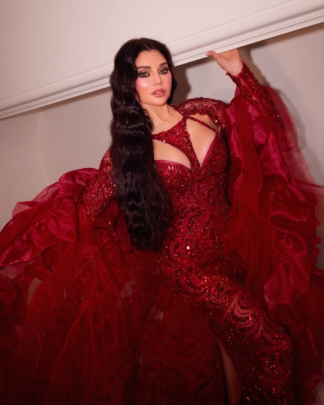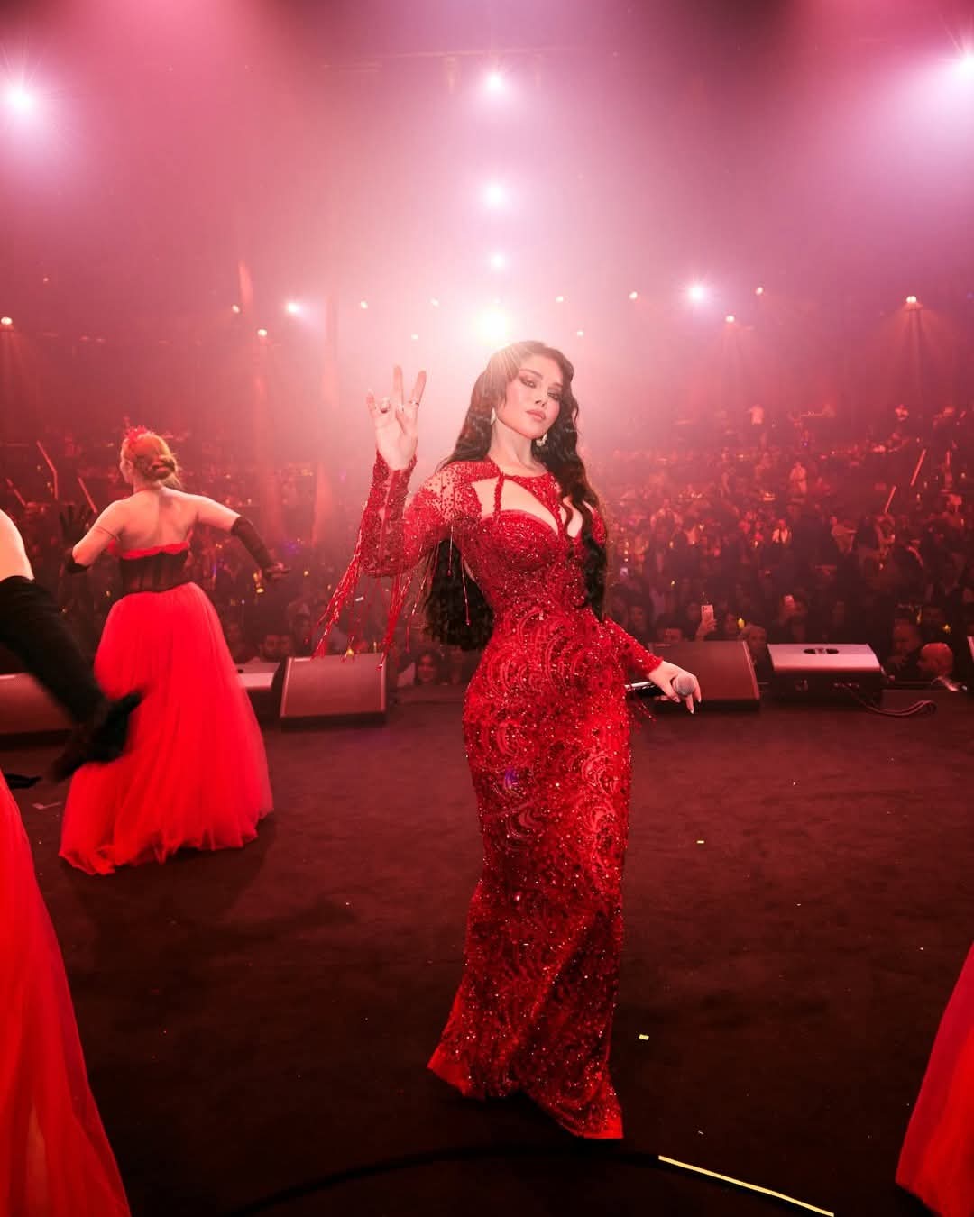 خلال حفلها في بيروت احتفالاً بعيد الحب، تألقت النجمة هيفاء وهبي بفستان أحمر مطرز بالكامل، عكس أجواء رومانسية فاخرة. التصميم جاء مرصعاً بالتطريزات اللامعة التي أضفت بريقاً خاصاً على المسرح، واختارت معه تسريحة شعر مموجة ومكياجاً جذاباً زاد من سحر حضورها أمام جمهورها.