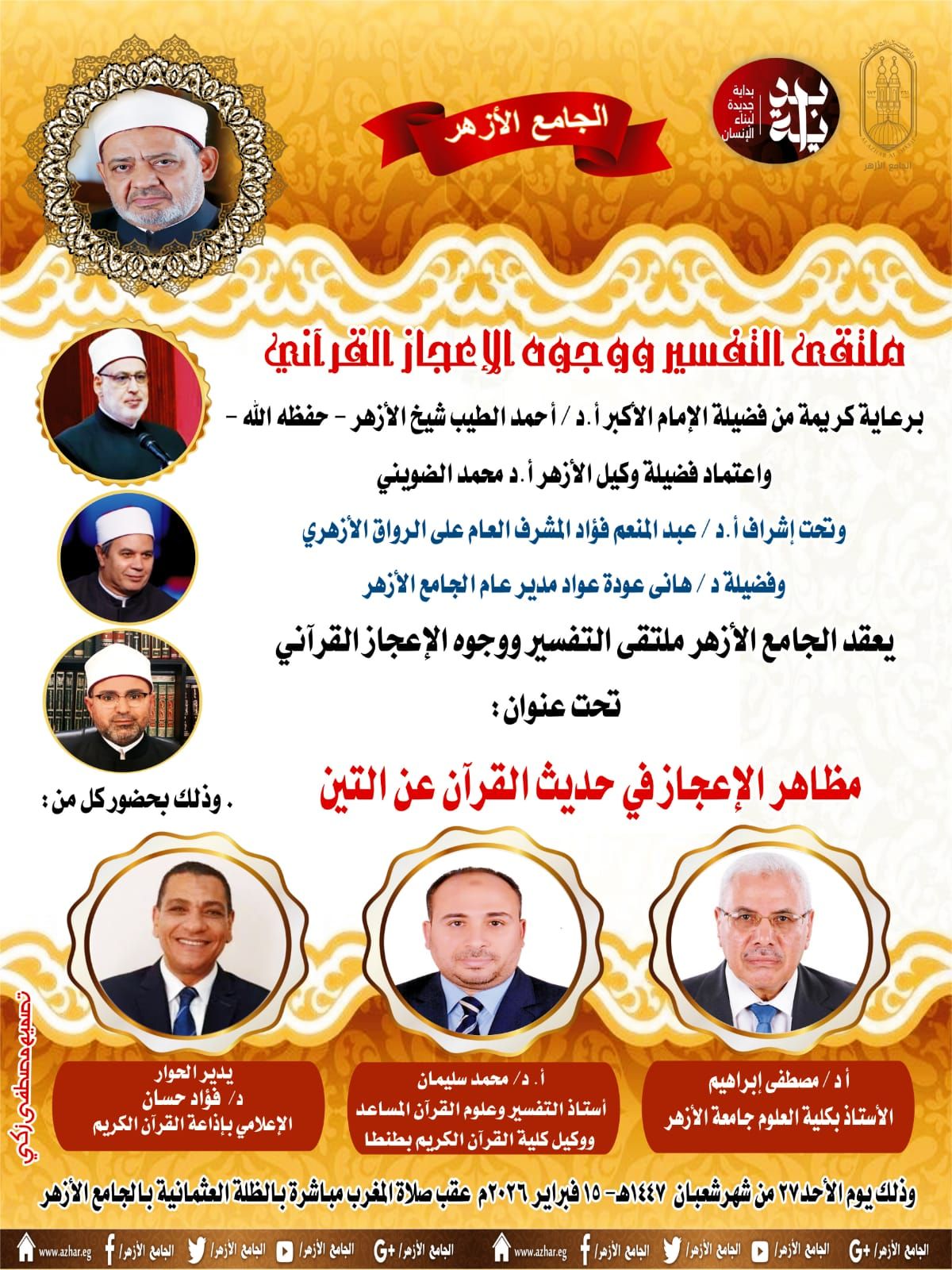 يواصل ملتقى التفسير بالجامع الأزهر اليوم، لقاء التفسير الأسبوعي بعنوان "مظاهر الإعجاز في حديث القرآن عن خلق التين" وذلك بحضور كل من: أ.د مصطفى إبراهيم، الأستاذ بكلية العلوم جامعة الأزهر، وأ. محمد سليمان، أستاذ التفسير وعلوم القرآن المساعد ووكيل كلية القرآن الكريم بطنطا، ويدير الحوار د. فؤاد حسان، الإعلامي بإذاعة القرآن الكريم.