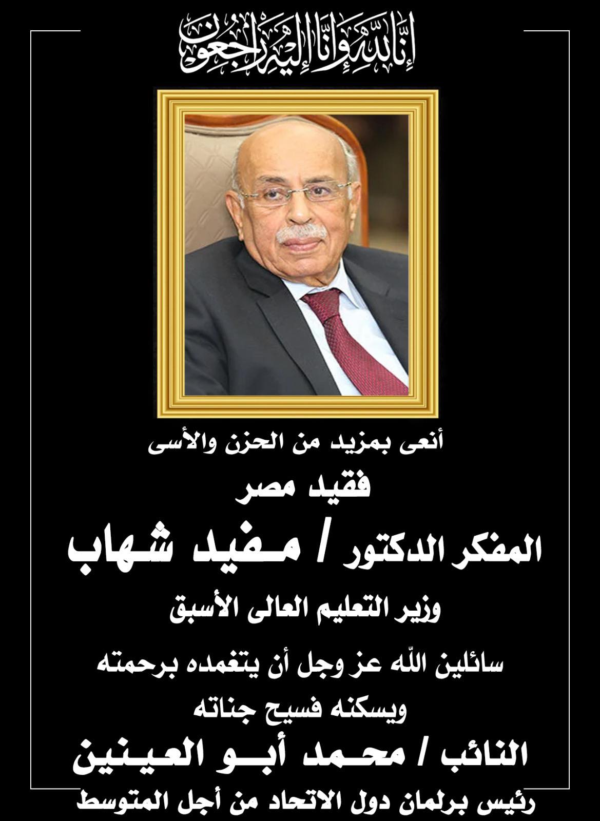 بمزيد من الحزن والأسى، ننعى الصديق العزيز، والأخ الغالي الدكتور/ مفيد شهاب، وزير التعليم العالي ووزير المجالس النيابية الأسبق، وأحد قامات مصر وأعلامها البارزين في القانون الدولي.