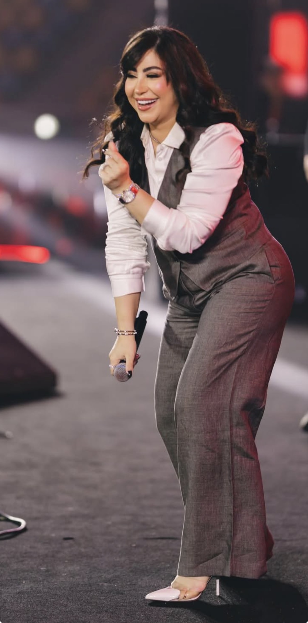 تألقت بوسي في الصور بإطلالة كلاسيك، حيث ارتدت بنطلون باللون الرمادي مع ڤيست بنفس اللون ونسقت معهما قميص أبيض.