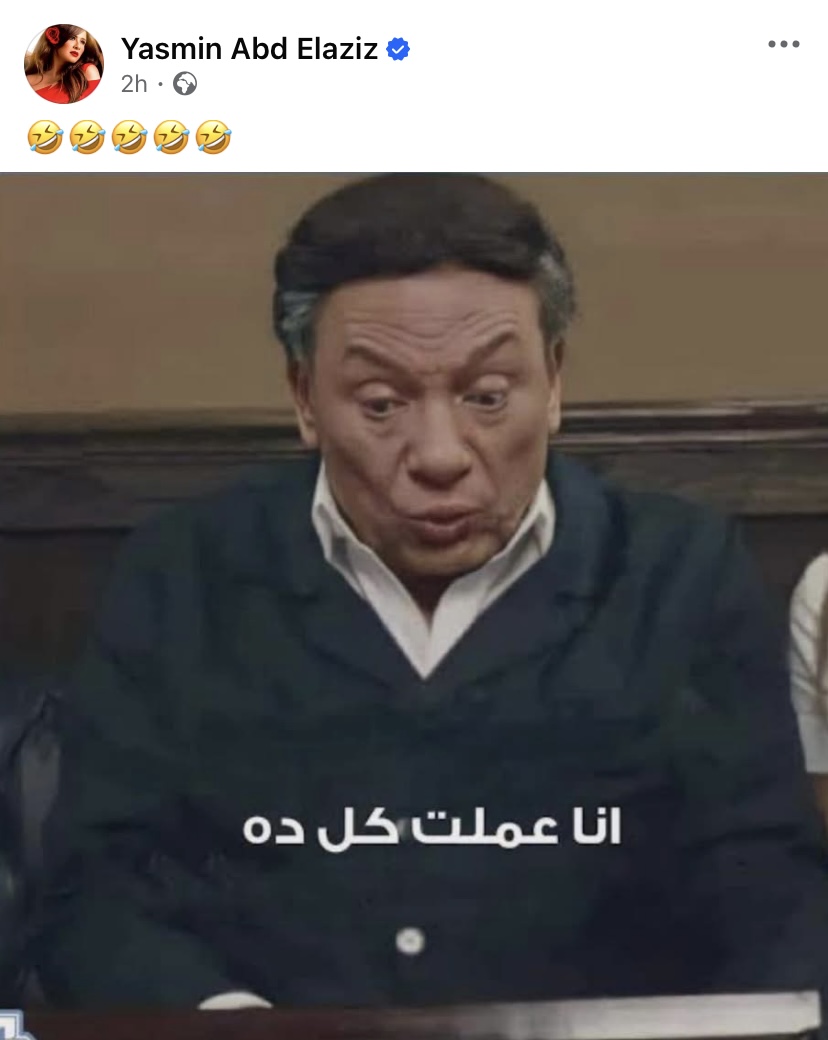 وشاركت ياسمين عبر حسابها صورة طريفة للفنان عادل إمام من فيلم زهايمر، مكتوب عليها: أنا عملت كل كده، فى إشارة إلى دهشتها من تكرار الشائعات التى تعرضت لها بشكل متواصل.