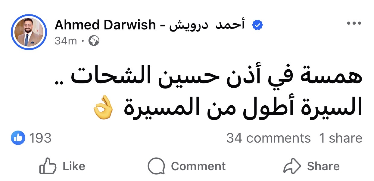 وكتب أحمد درويش، عبر حسابه على فيسبوك "همسة في أذن حسين الشحات .. السيرة أطول من المسيرة".