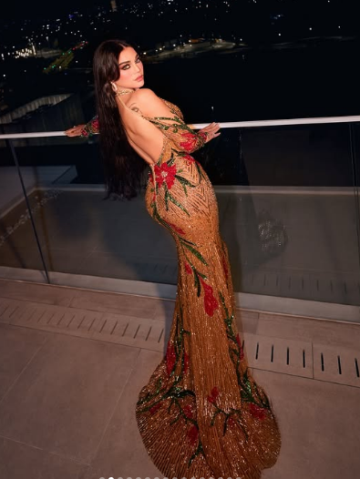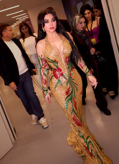 لافتت هيفاء وهبي الأنظار في احدث ظهور، حيث ظهرت مرتدية فستان طويل ذا أكمام طويلة و اتسم التصميم بالتطريزات ذات الألوان المميزة المتناسقة مع لون بشرتها.