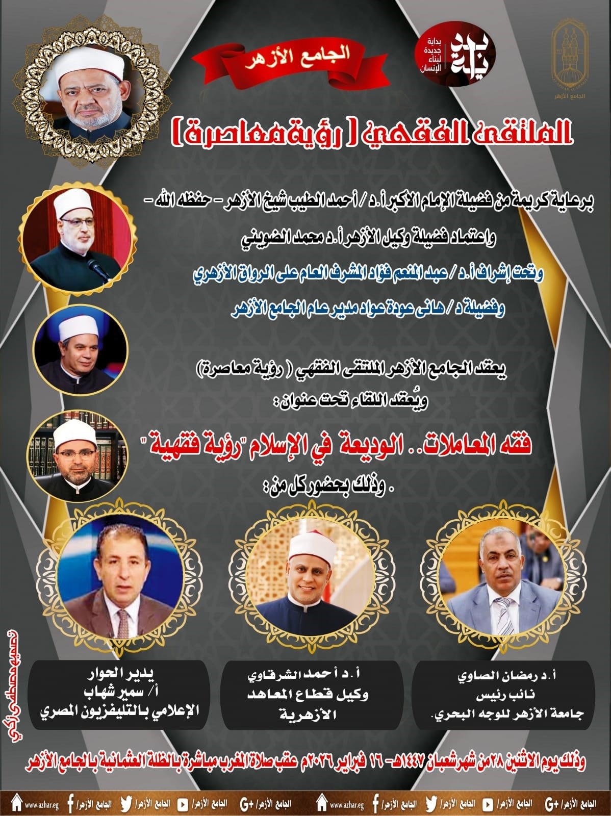 وأكد د. عبد المنعم فؤاد، المشرف العام على الأروقة الأزهرية، أن الملتقى يُعدّ منصة هامة لتوضيح الصلة الوثيقة بين الطب والشرع في شتى مناحي الحياة، ويعكس جهود الأزهر في تقديم حلول متكاملة تتماشى مع الدين الإسلامي وتحديات العصر، مبيناً أن الوديعة في الإسلام هي عقد أمانة يُعهد فيه بحفظ مال أو متاع لشخص أمين، وتعتبر من عقود التبرع (في أصلها) المستحبة لتوثيق الأمانة بين الناس، وتجب فيها المحافظة عليها وردها عند الطلب.