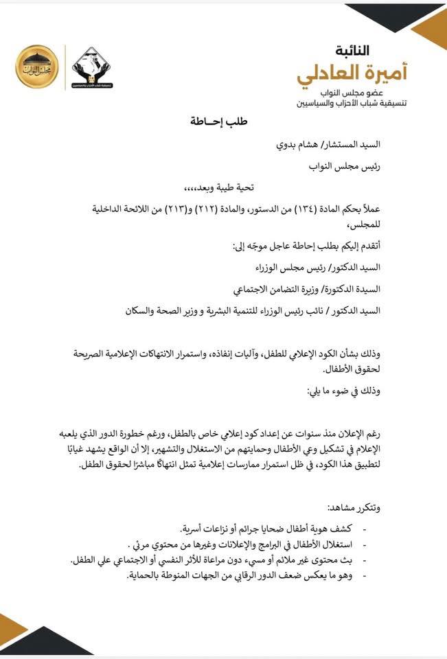 والدكتورة وزيرة التضامن الاجتماعي و الدكتور / نائب رئيس الوزراء للتنمية البشرية و وزير الصحة والسكان ، وذلك بشأن الكود الإعلامي للطفل، وآليات إنفاذه واستمرار الانتهاكات الإعلامية الصريحةلحقوق الأطفال.