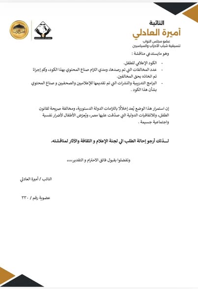 وأضافت: يأتي ذلك في ضوء ما يلي أنه رغم الإعلان منذ سنوات عن إعداد كود إعلامي خاص بالطفل، ورغم خطورة الدور الذي يلعبه الإعلام في تشكيل وعي الأطفال وحمايتهم من الاستغلال والتشهير، إلا أن الواقع يشهد غيابًا لتطبيق هذا الكود في ظل استمرار ممارسات إعلامية تمثل انتهاكا مباشرا لحقوق الطفل وتتكرر مشاهدکشف هوية أطفال ضحايا جرائم أو نزاعات أسرية ، و استغلال الأطفال في البرامج والإعلانات وغيرها من محتوي مرئي ، و بث محتوى غير ملائم أو مسيء دون مراعاة للأثر النفسي أو الاجتماعي علي الطفل. وهو ما يعكس ضعف الدور الرقابي من الجهات المنوطة بالحماية.