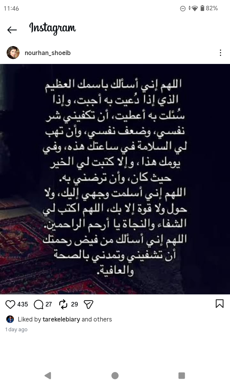 وكتبت نورهان عبر صفحتها الرسمية علي موقع التواصل الاجتماعي "إنستجرام":"اللهم إنى أسألك باسمك العظيم الذى إذا دعيت به أجبت، وإذا سئلت به أعطيت أن تكفينى شر نفسى، وضعف نفسى وتهب لى السلامة وساعتك هذه، وفى يومك هذا لا كتبت لى الخير حيث كان، وأن ترضنى به، اللهم إنى أسلمت وجهى إليك ولا حول ولا قوة إلا بك"