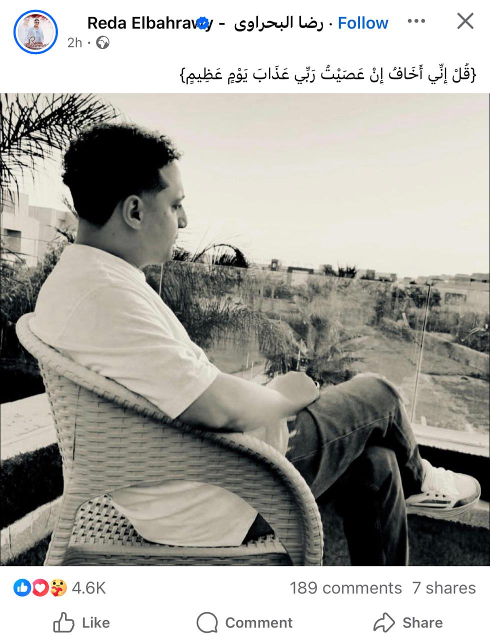 وكتب رضا البحراوي عبر صفحته على موقع التواصل الاجتماعي فيسبوك : "قُلْ إِنِّي أَخَافُ إِنْ عَصَيْتُ رَبِّي عَذَابَ يَوْمٍ عَظِيمٍ".