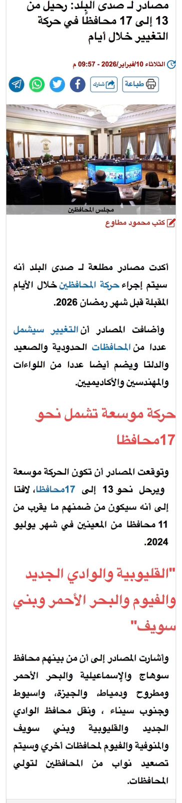 تأكيد لما نشره صدي في 10 فبراير الجاري بشأن بقاء عدد من المحافظين ونقل بعضهم ومغادرة بعضهم حيث أكدت مصادر مطلع لصدى البلد عن نقل محافظ الوادي الجديد و المنوفية و الفيوم والقليوبية لمحافظات أخرى.