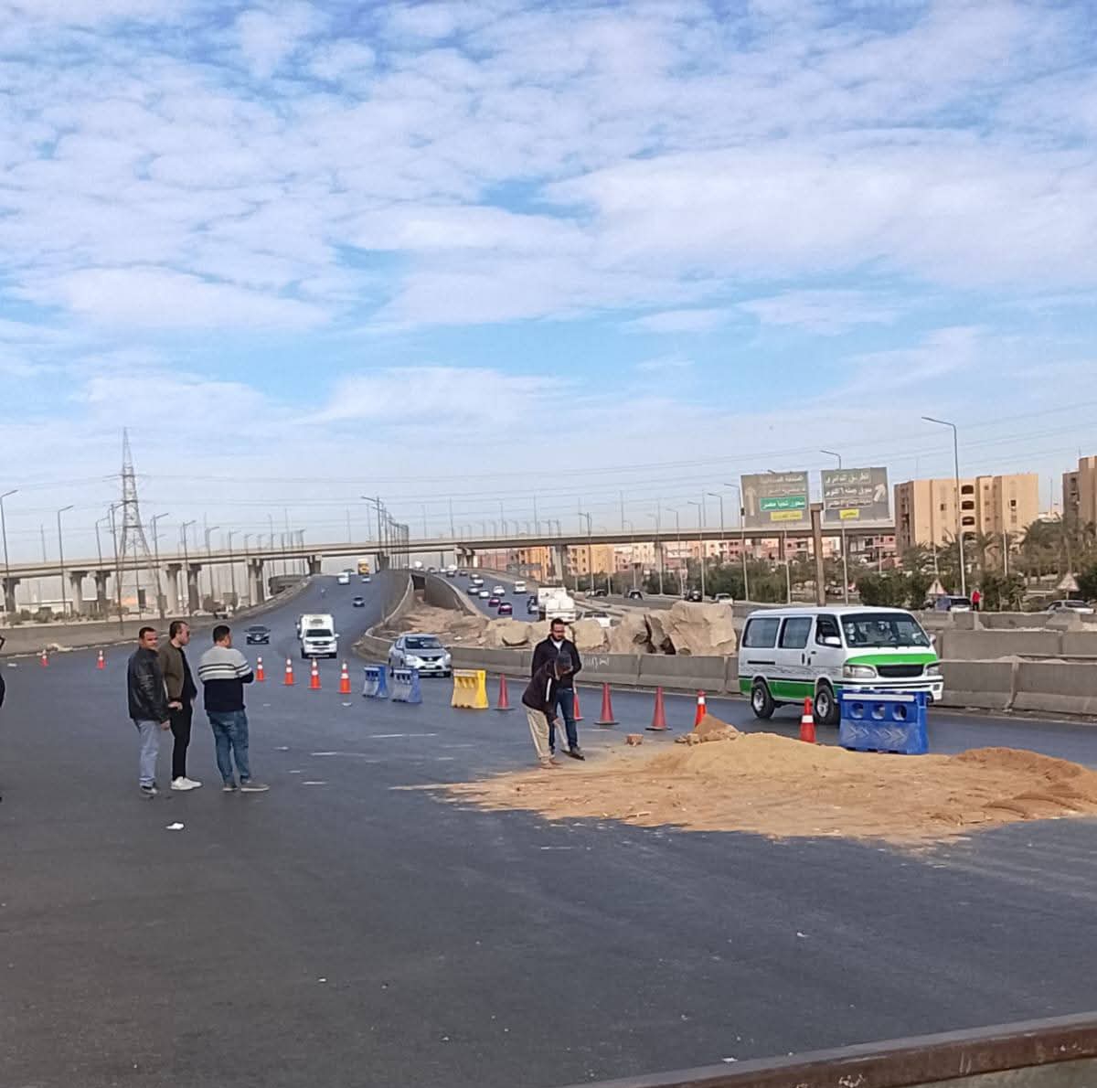 أجرت الإدارة العامة لمرور الجيزة تحويلة مرورية بمحيط انهيار أرضي أعلى الطريق الأوسطي بنزلة الواحات.