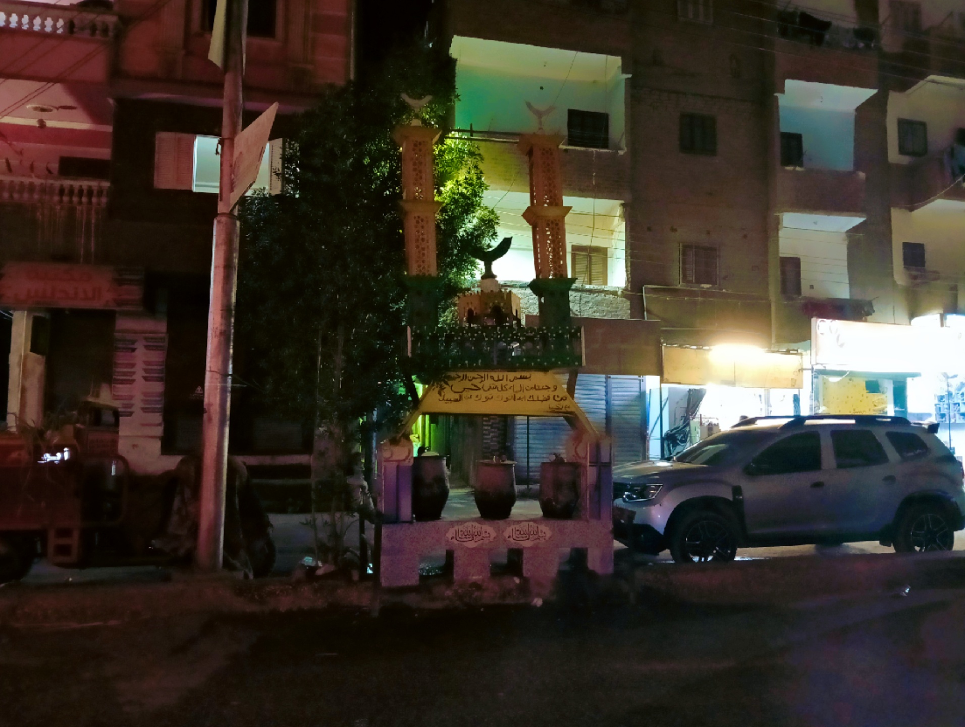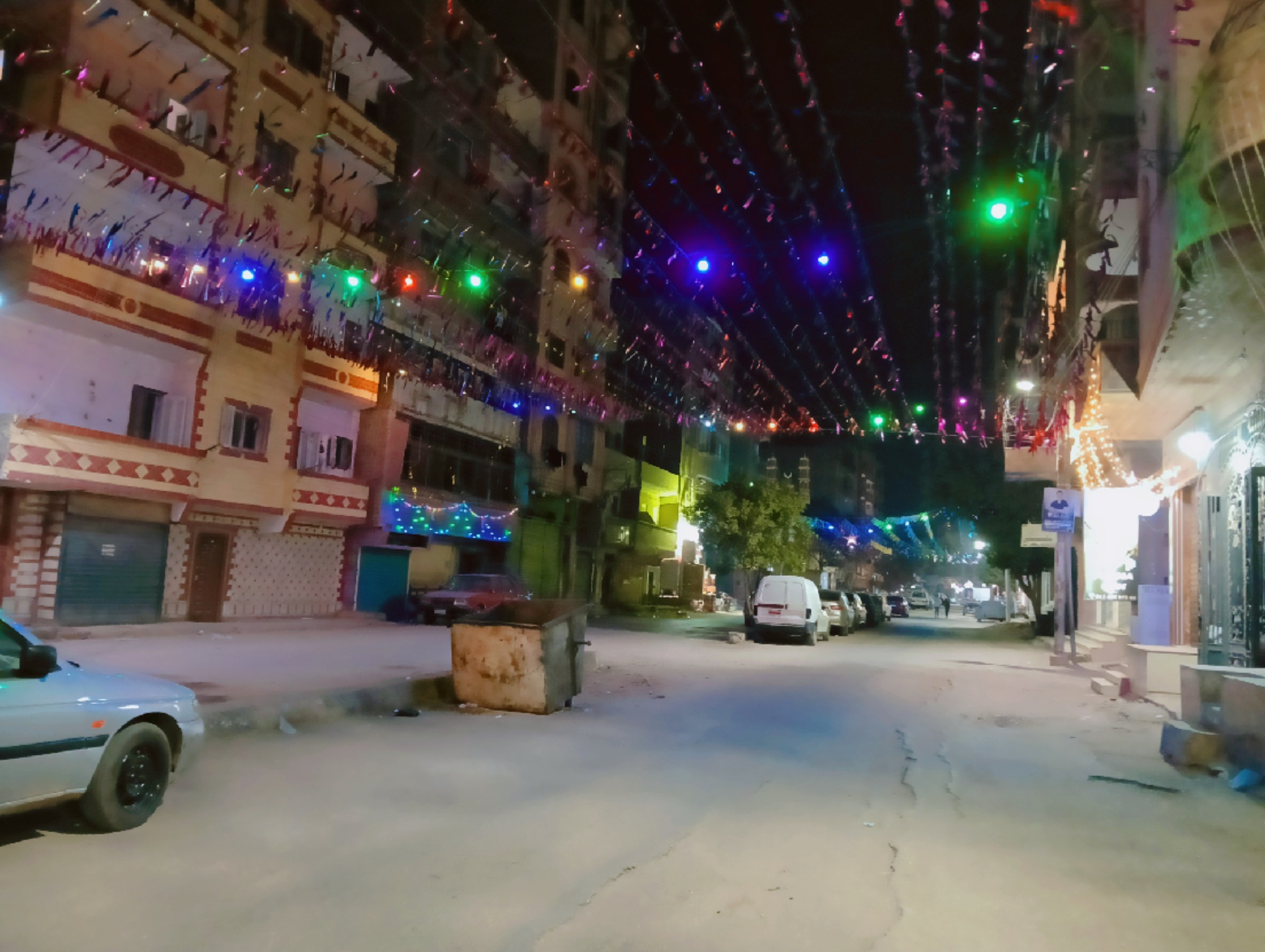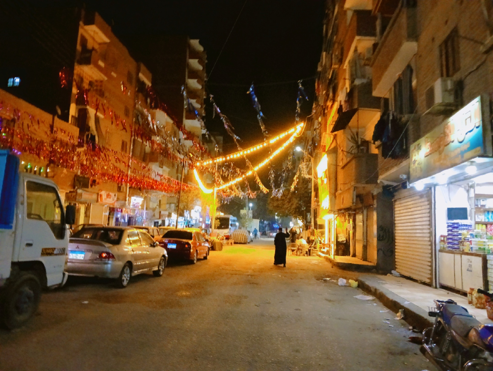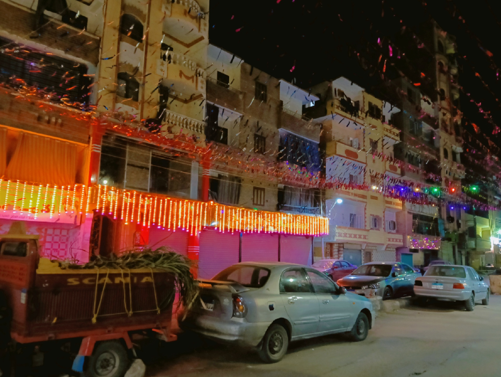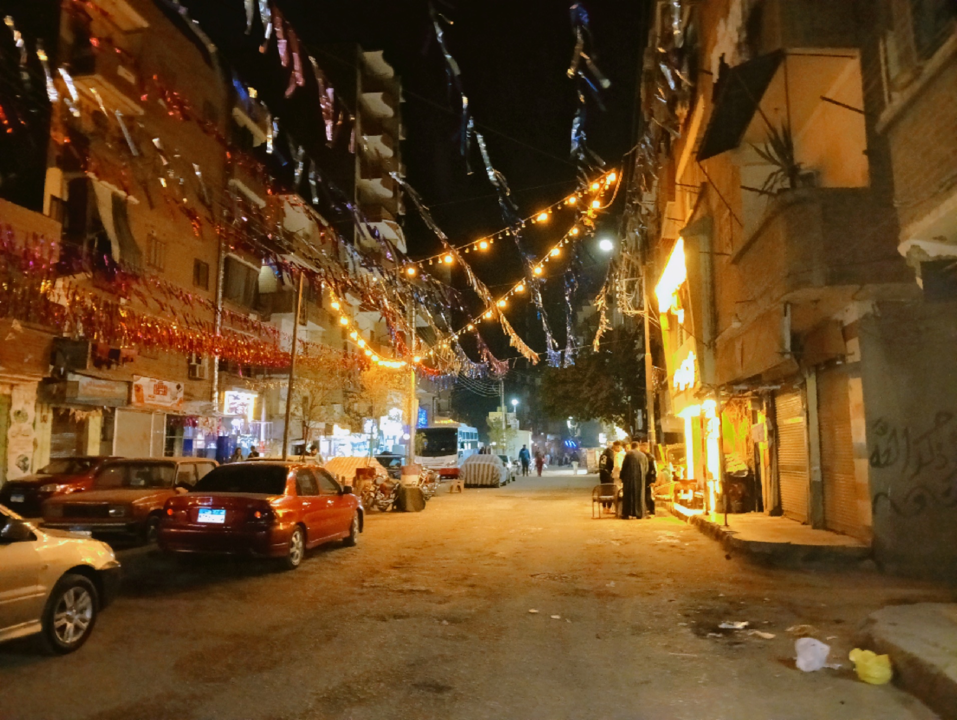 وعلى جانبي الطرق، اصطفت السيارات أسفل خيوط الزينة الملونة التي تناثرت كشرائط احتفالية، بينما أُضيئت المحال التجارية بألوان زاهية أضفت أجواءً دافئة على المكان.