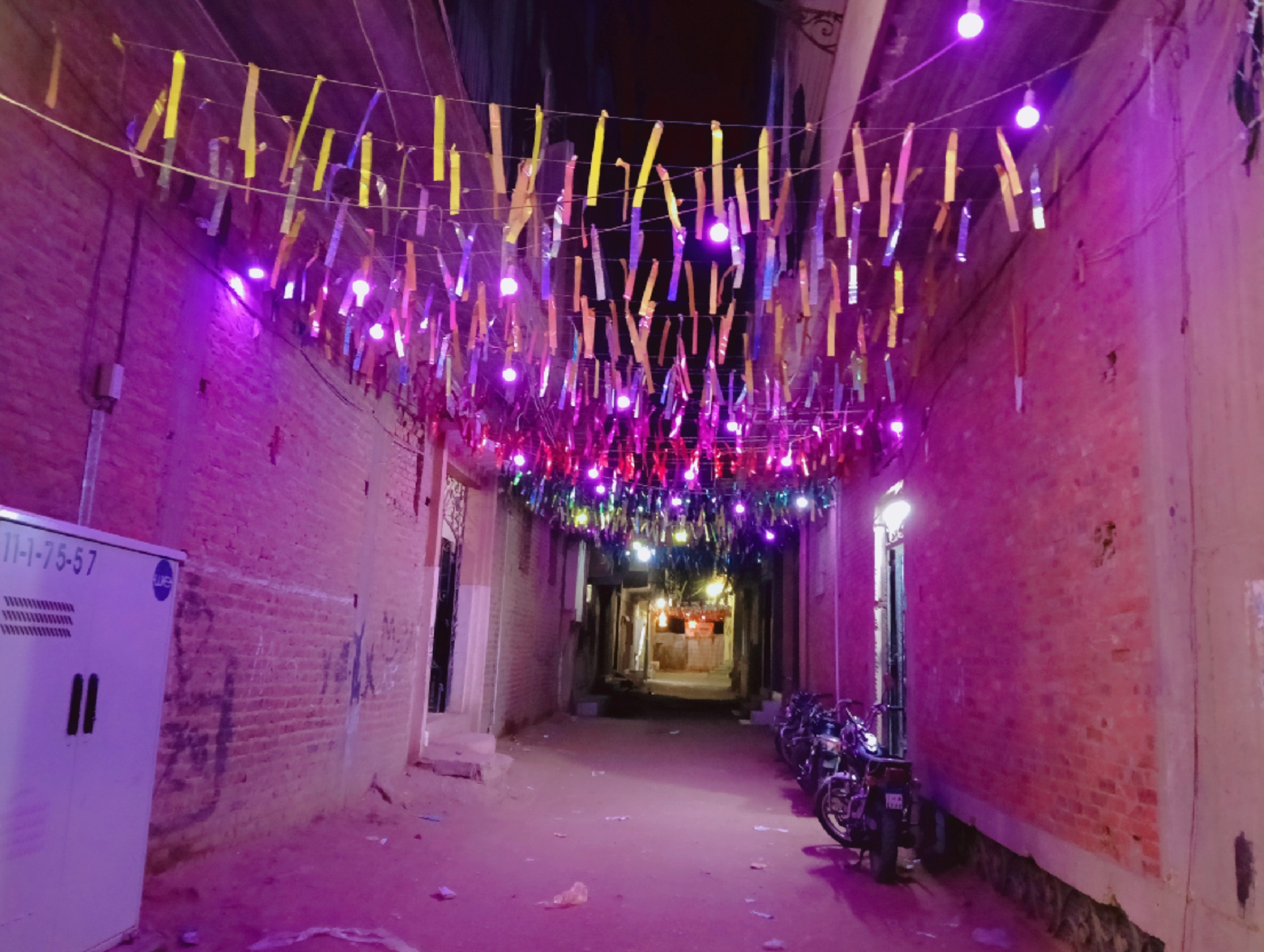 وفي الأزقة الجانبية، ظهر الطابع الشعبي الأصيل؛ حبال ممتدة بين الشرفات عُلقت عليها شرائط لامعة بألوان الأحمر والأصفر والأخضر، تتمايل مع نسمات الليل، وأسفلها مصابيح صغيرة تتوهج بضياء برتقالي هادئ، مانحة الممرات الضيقة سحرًا خاصًا.