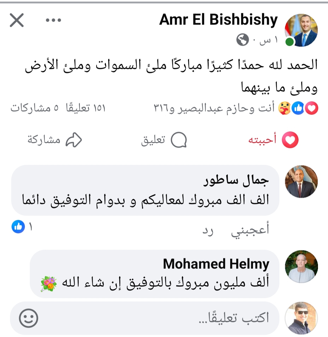 وقال البشبيشي، عبر صفحته الشخصية على موقع التواصل الاجتماعي «فيسبوك»: الحمد لله حمدًا كثيرًا مباركًا ملء السموات وملء الأرض وملء ما بينهما.