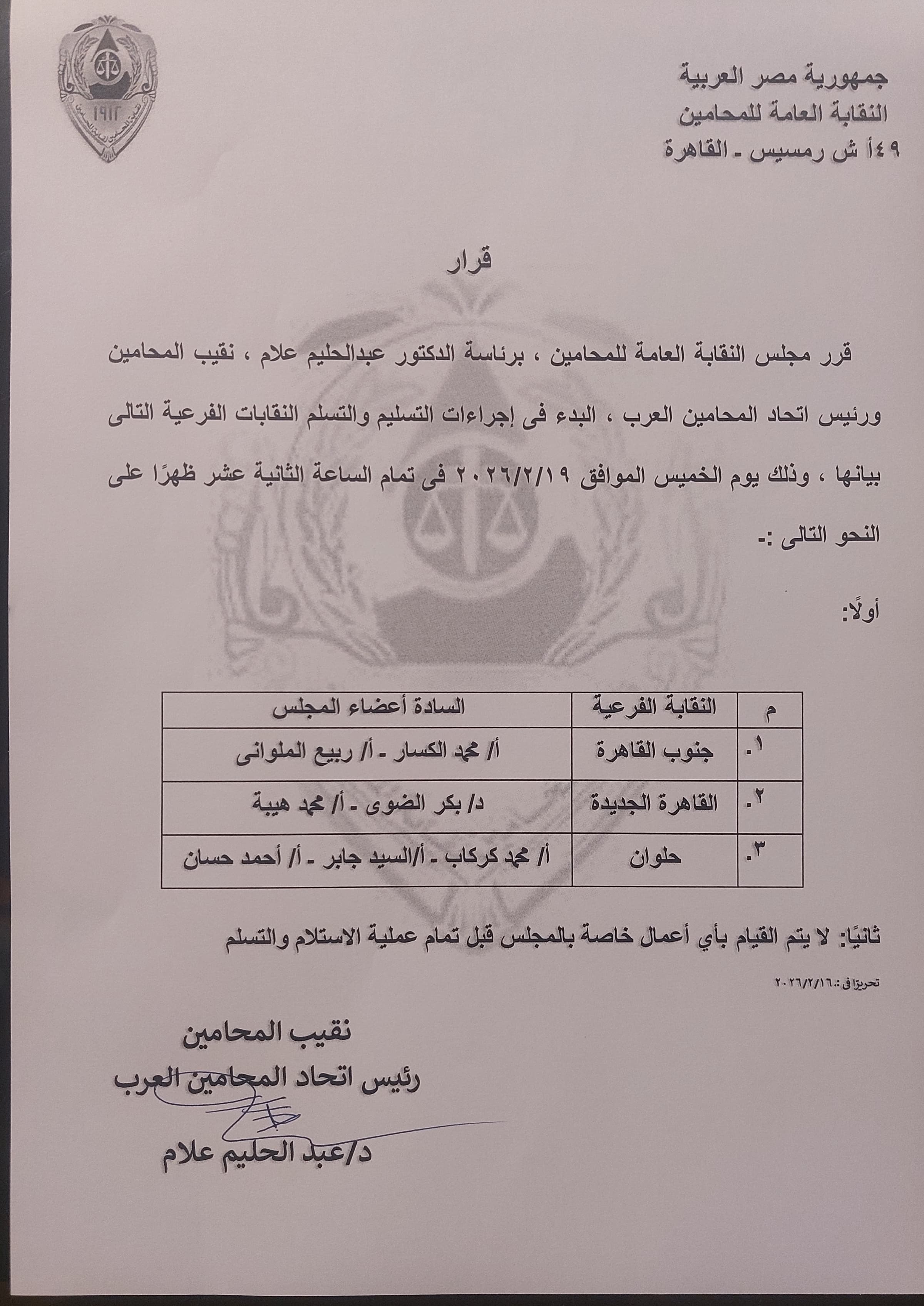 قرر مجلس النقابة العامة، برئاسة الدكتور عبد الحليم علام، نقيب المحامين، رئيس اتحاد المحامين العرب، البدء في إجراءات التسليم والتسلم للنقابات الفرعية التالي بيانها، وذلك يوم الخميس الموافق 19/2/2026، في تمام الساعة الثانية عشر ظهرا، على النحو التالي: