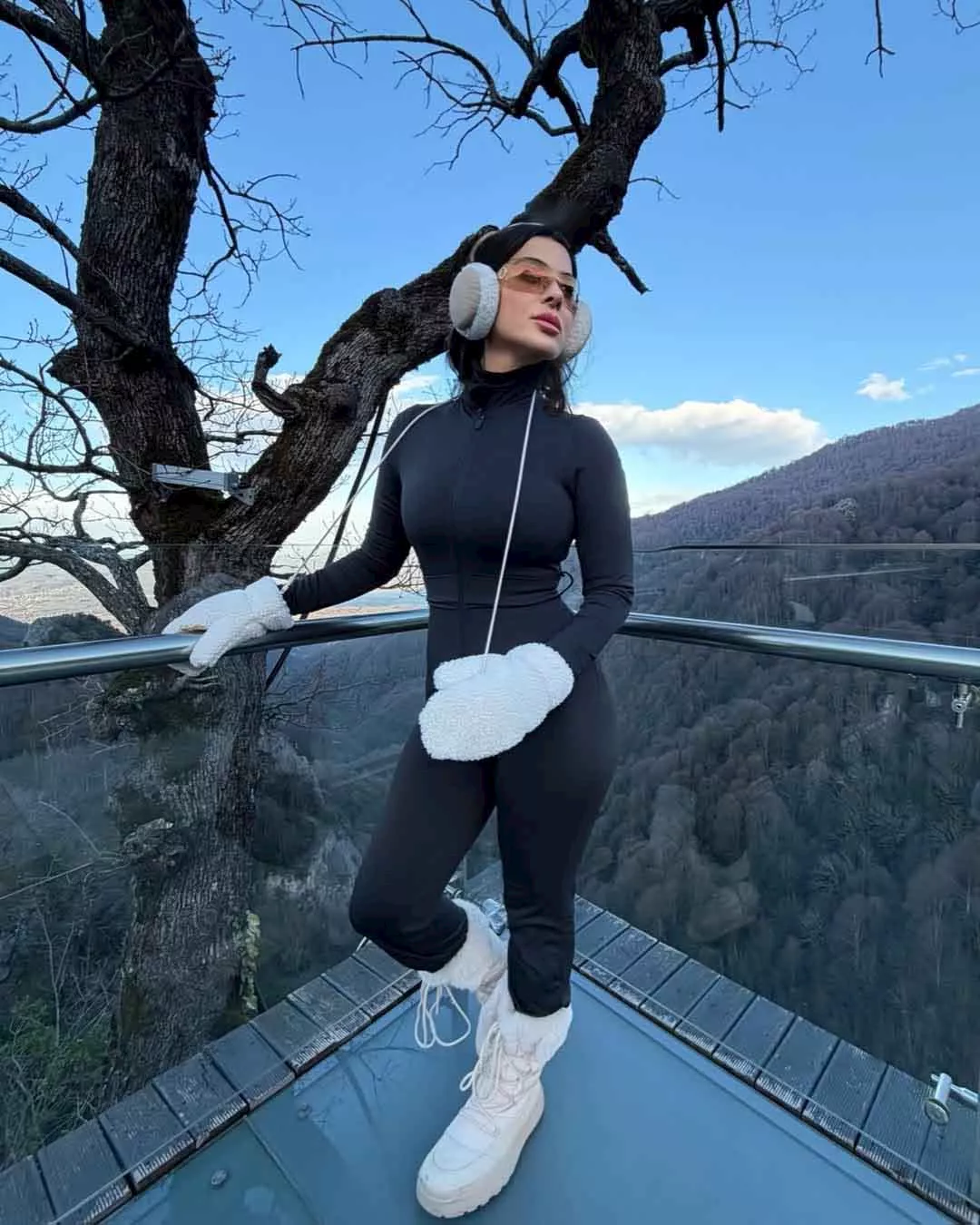 وظهرت النجمة نورهان منصور بإطلالة شتوية أنيقة وجريئة مرتدية جامسوت سوداء والتقطت صورة وسط مناظر طبيعية خلابة من الجبال والأشجار ، عبر حسابها الرسمي على موقع "إنستجرام".