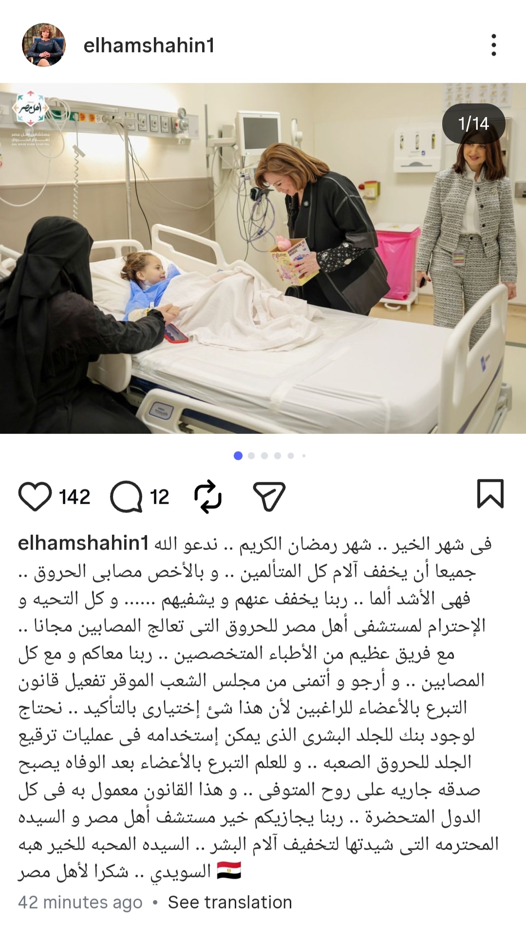 و كتبت إلهام شاهين: في شهر الخير.. شهر رمضان الكريم.. ندعو الله جميعا أن يخفف آلام كل المتألمين.. وبالأخص مصابي الحروق.. فهي الأشد ألما.. ربنا يخفف عنهم ويشفيهم.. وكل التحية والاحترام لمستشفى أهل مصر للحروق التي تعالج المصابين مجانًا.. مع فريق عظيم من الأطباء المتخصصين.. ربنا معاكم ومع كل المصابين.