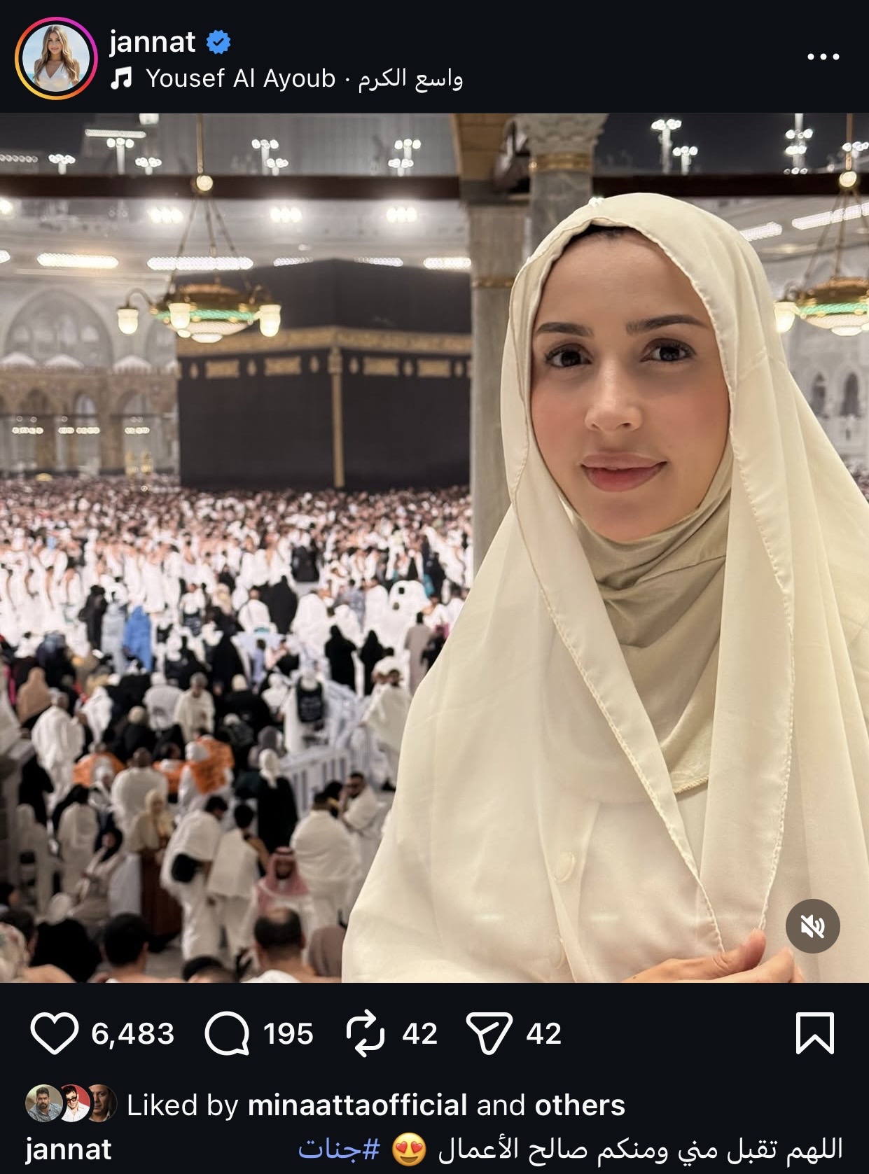 نشرت الفنانة جنات صورة لها أثناء أداء مناسك العمرة، عبر حسابها على موقع إنستجرام، وعلقت عليها: “اللهم تقبل مني ومنكم صالح الأعمال”.