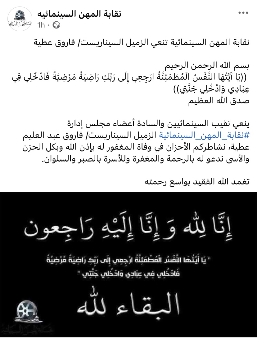 وتابع البيان: "ينعى نقيب السينمائيين والسادة أعضاء مجلس إدارة نقابة المهن السينمائية الزميل السيناريست/ فاروق عبد العليم عطية، ونشاطركم الأحزان في وفاة المغفور له بإذن الله، وندعو له بالرحمة والمغفرة، ولأسرته بالصبر والسلوان. تغمد الله الفقيد بواسع رحمته".