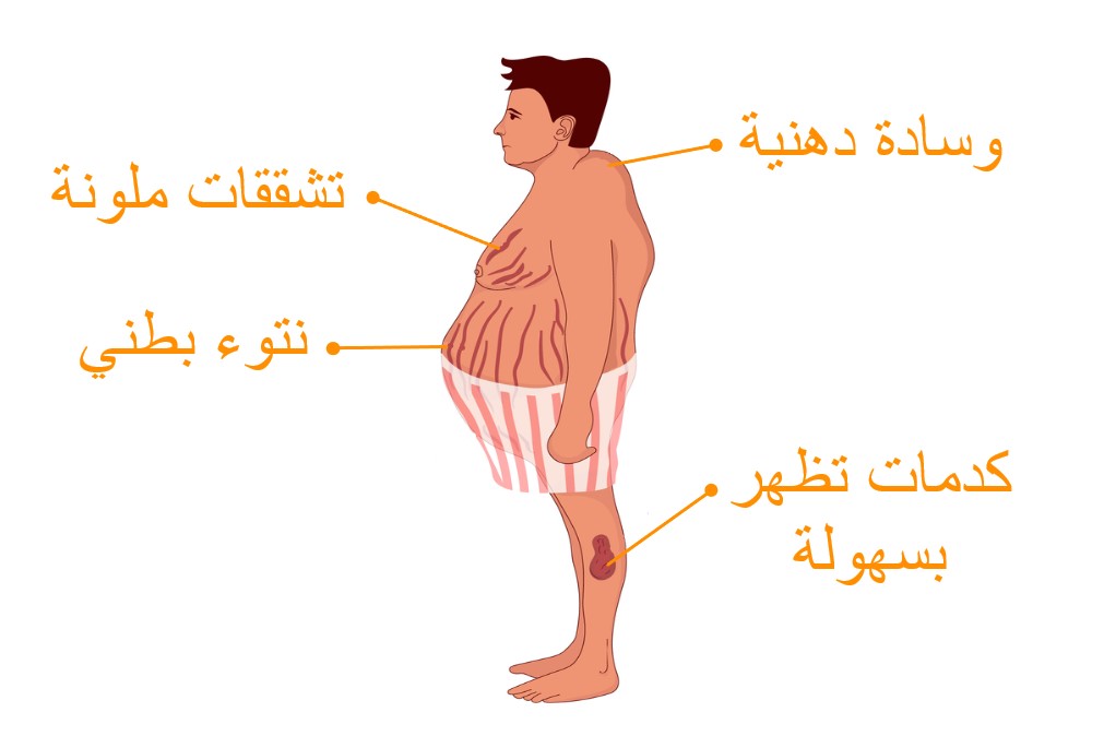زيادة الوزن من الأعراض الشائعة لمتلازمة كوشينج، وهي حالة مرضية ينتج عنها ارتفاع مستوى هرمون الكورتيزول، هرمون التوتر، مما يؤدي بدوره إلى زيادة الوزن واضطرابات أخرى، و قد تُصاب بمتلازمة كوشينغ إذا كنت تتناول الستيرويدات لعلاج الربو أو التهاب المفاصل أو الذئبة كما قد تحدث أيضًا عند إفراز الغدد الكظرية كمية زائدة من الكورتيزول، أو قد تكون مرتبطة بورم وتكون زيادة الوزن أكثر وضوحًا في منطقة الوجه أو الرقبة أو أعلى الظهر أو الخصر.