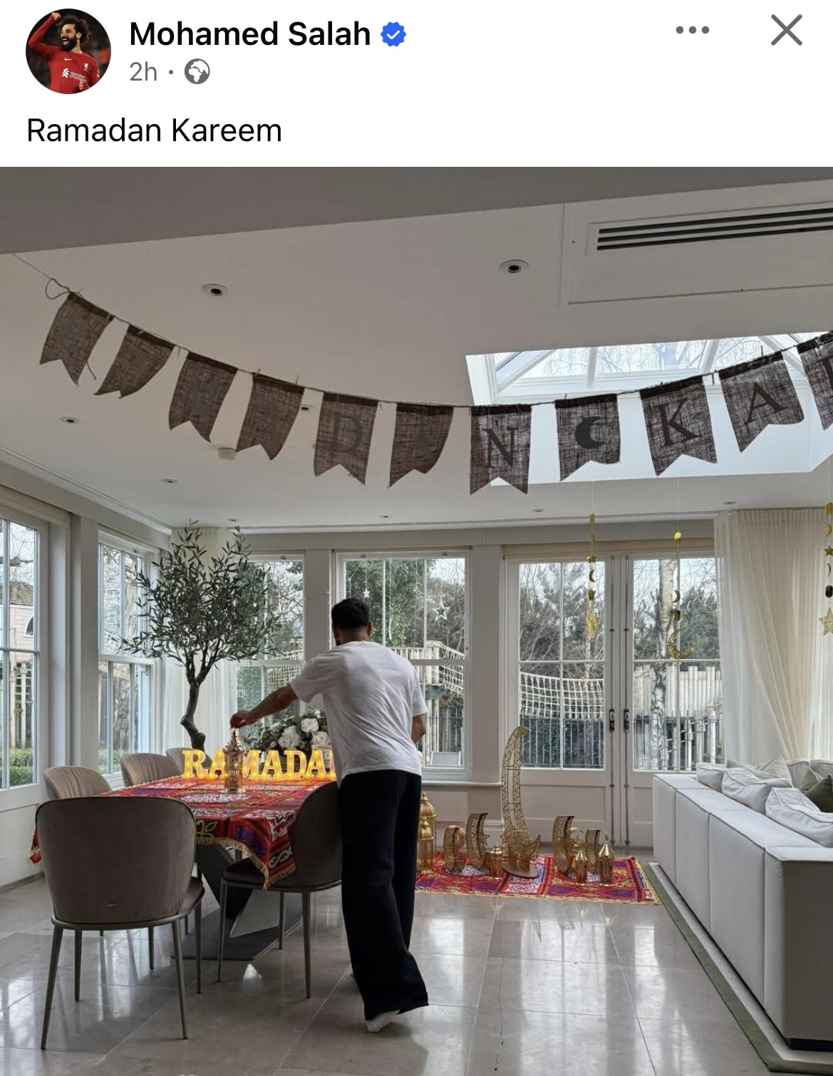 شارك محمد صلاح، لاعب ليفربول الإنجليزي صورة جديدة عبر حسابه الشخصي على موقع التواصل الاجتماعي فيسبوك، من مظاهر الاحتفال بشهر رمضان المبارك.