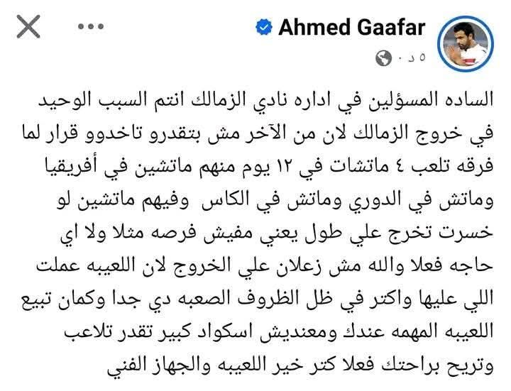 وكتب أحمد جعفر عبر حسابه الرسمي على فيس بوك: السادة المسؤولين في إدارة نادي الزمالك، أنتم السبب الوحيد في خروج الزمالك، لأن من الآخر مش بتقدروا تاخدوا قرار.