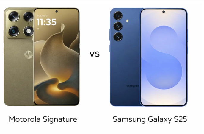 يستخدم هاتف سامسونج جالاكسي إس 25 زجاج جوريلا فيكتوس 2 في الجهتين الأمامية والخلفية، مع إطار من الألومنيوم المقوى 2، ومقاوم للماء والغبار بمعيار IP68. بفضل تصميمه الصغير، يُمكن حمله بسهولة في الجيب واستخدامه بيد واحدة. يتميز تصميم هاتف سامسونج بلمسة نهائية أنيقة وراقية، بينما يميل تصميم موتورولا إلى الجرأة والتركيز على الأداء.