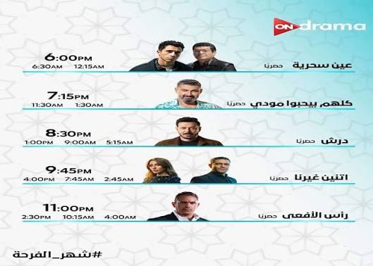 - على قناة ON: الياعة 7 مساء، و5:15 صباحاً، و2 ظهرا