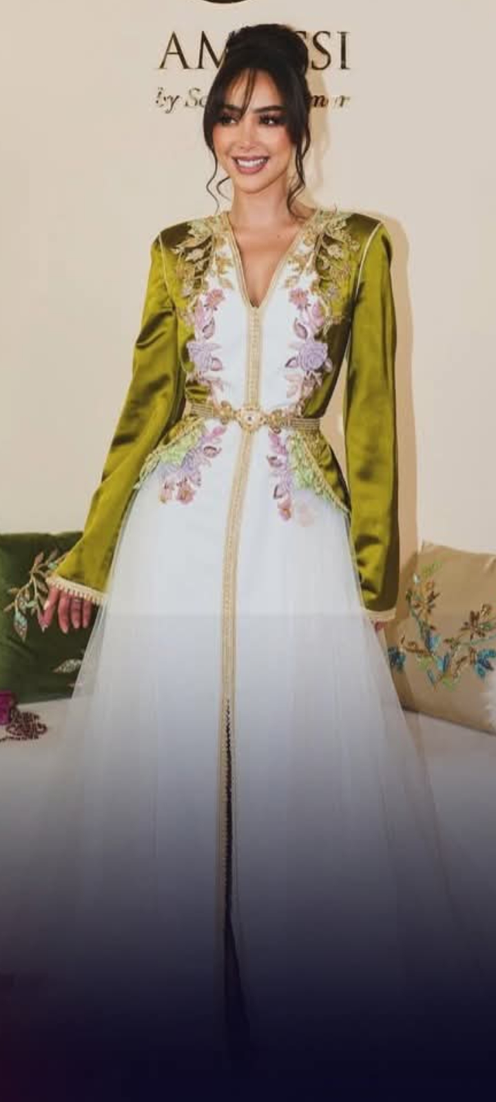 اختارت قفطانًا بألوان دافئة مستوحاة من أجواء المغرب، مع لمسات تطريز كثيفة على الأكمام، واعتمدت تسريحة شعر مرفوعة أبرزت تفاصيل التصميم.