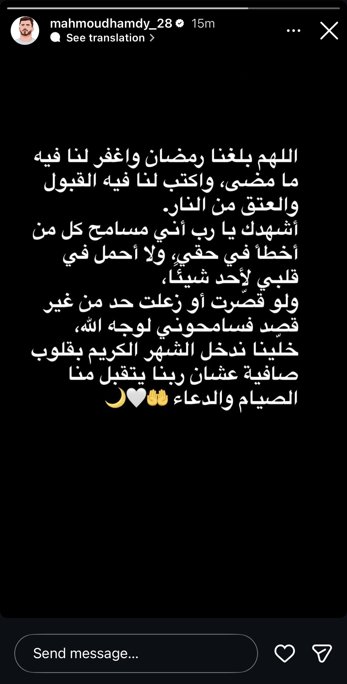 وكتب الونش عبر ستوري حسابه على انستجرام: “اشهدك يارب اني مسامح كل من اخطأ في حقي ولا احمل في قلبي لاحد شيء ولو قصرت او زعلت حد من غير قصد فسامحوني لوجه الله ”.
