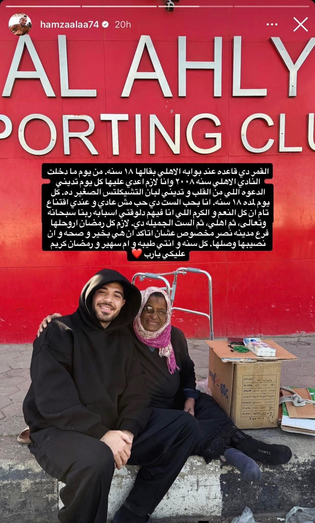 وكتب حمزة علاء عبر ستوري انستجرام: “القمر دي قاعدة عند بوابة الأهلي بقالها 18 سنة، من يوم ما دخلت النادي الأهلي سنه 2006 وانا لازق أعدي عليها كل يوم تديني الدعوة اللي من القلب وتديني لبان، كل يوم لمدة 18 سنة أنا بحب الست دي حب مش عادي وعندي اقتناع تام إن كل النعم والكرم اللي أنا فيه دلوقتي أسبابها ربنا سبحانه وتعالى، ثم أهلي، ثم الست الجميلة دي”.