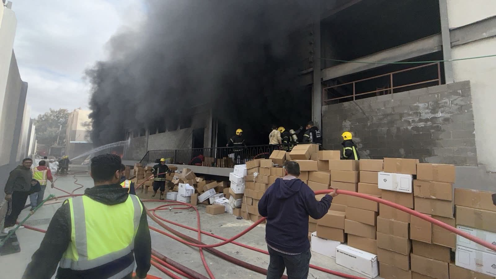 وتبين تصاعد سحابات سوداء من الأدخنة جراء الحريق وأن النيران اشتعلت في أحد مصانع بالقطعة 178 امتداد الصناعية الثالثة.