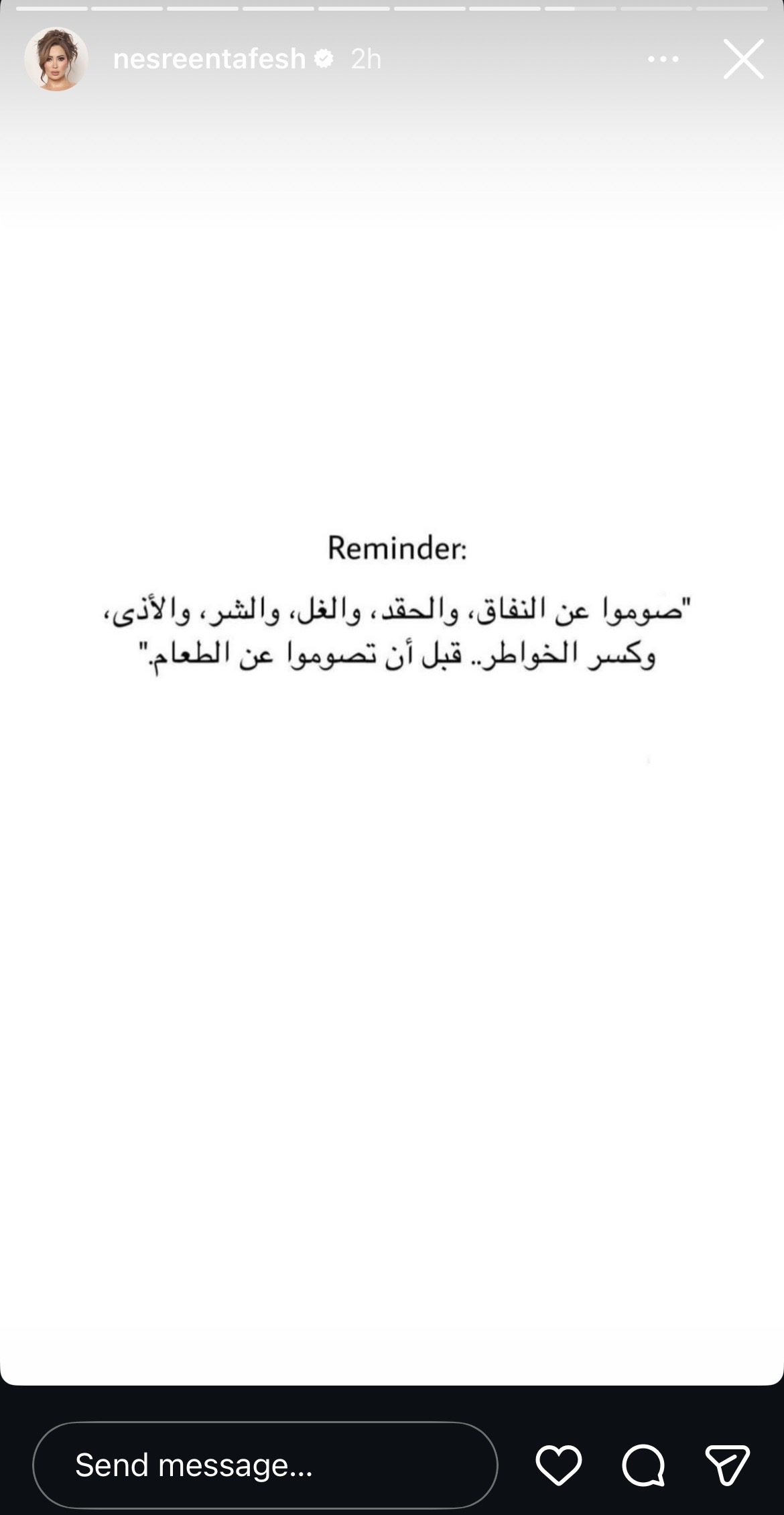 وجهت الفنانة نسرين طافش، رسالة في أحدث ظهور عبر حسابها الشخصي على موقع التواصل الاجتماعي انستجرام، بمناسبة شهر رمضان.