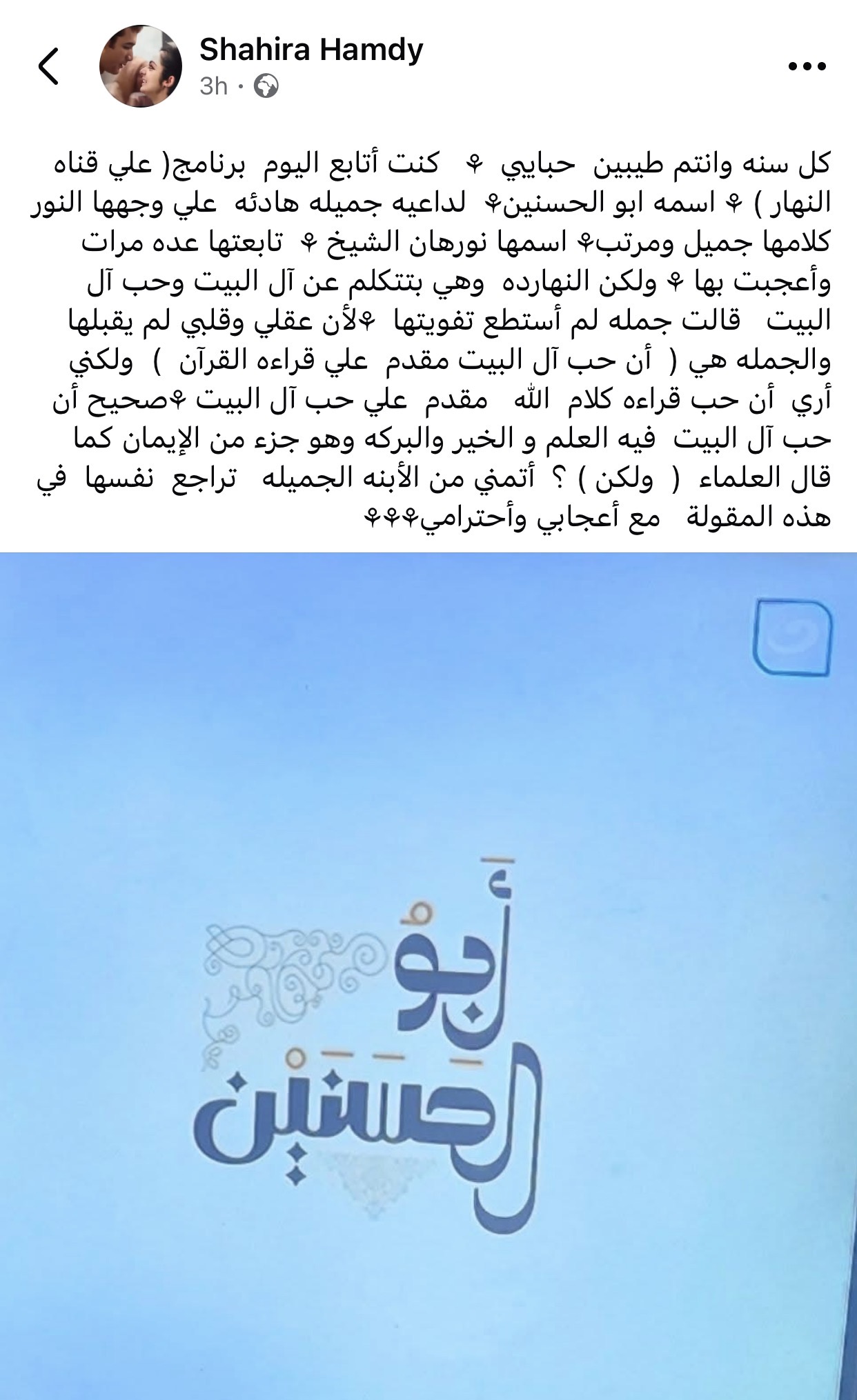 وأكدت شهيرة في منشورها أن حب آل البيت جزء من الإيمان، ويحمل الخير والبركة كما قال العلماء، لكنها شددت على أن حب قراءة كلام الله يجب أن يكون في المقدمة، معربة عن أمنيتها بأن تراجع الداعية هذه المقولة، ومؤكدة في الوقت ذاته احترامها وتقديرها لها