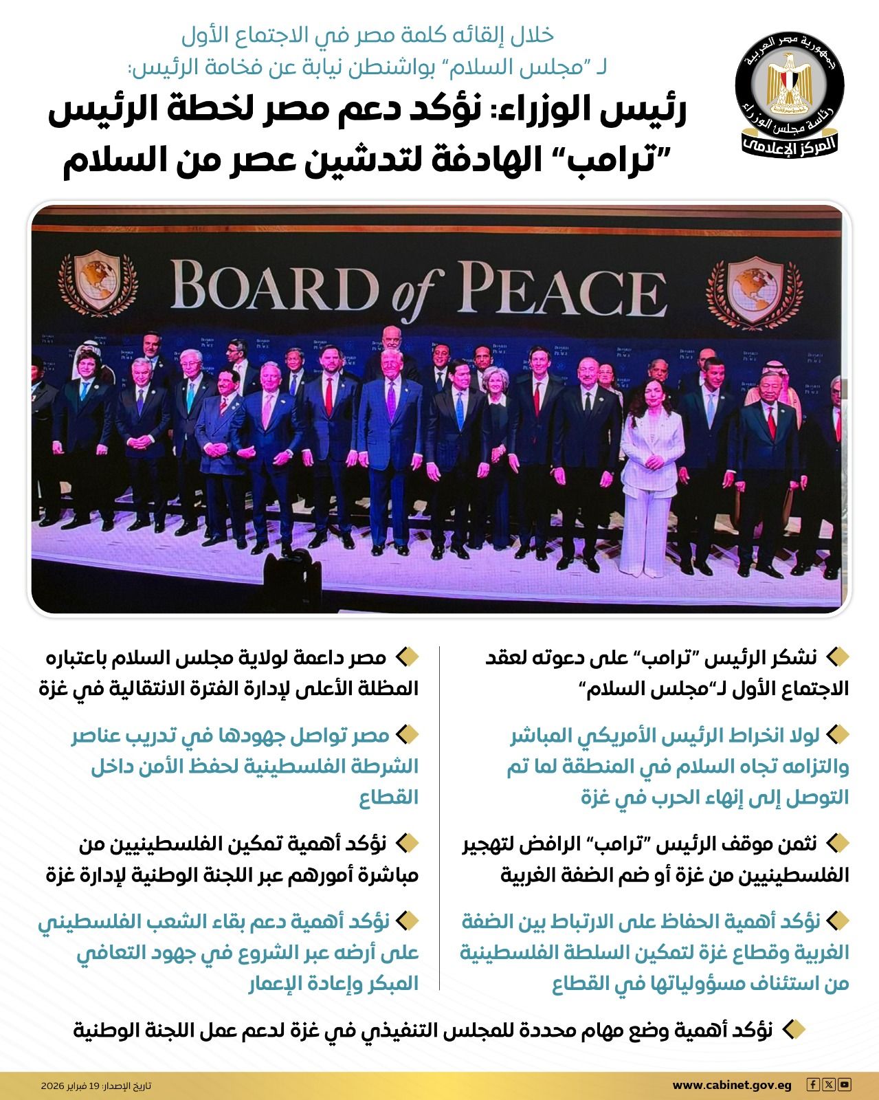 وألقى الدكتور مصطفى مدبولي، رئيس مجلس الوزراء، نيابة عن الرئيس عبدالفتاح السيسي، رئيس الجمهورية، كلمة مصر خلال الاجتماع الأول لـ "مجلس السلام"، الذي تستضيفه العاصمة الأمريكية "واشنطن".