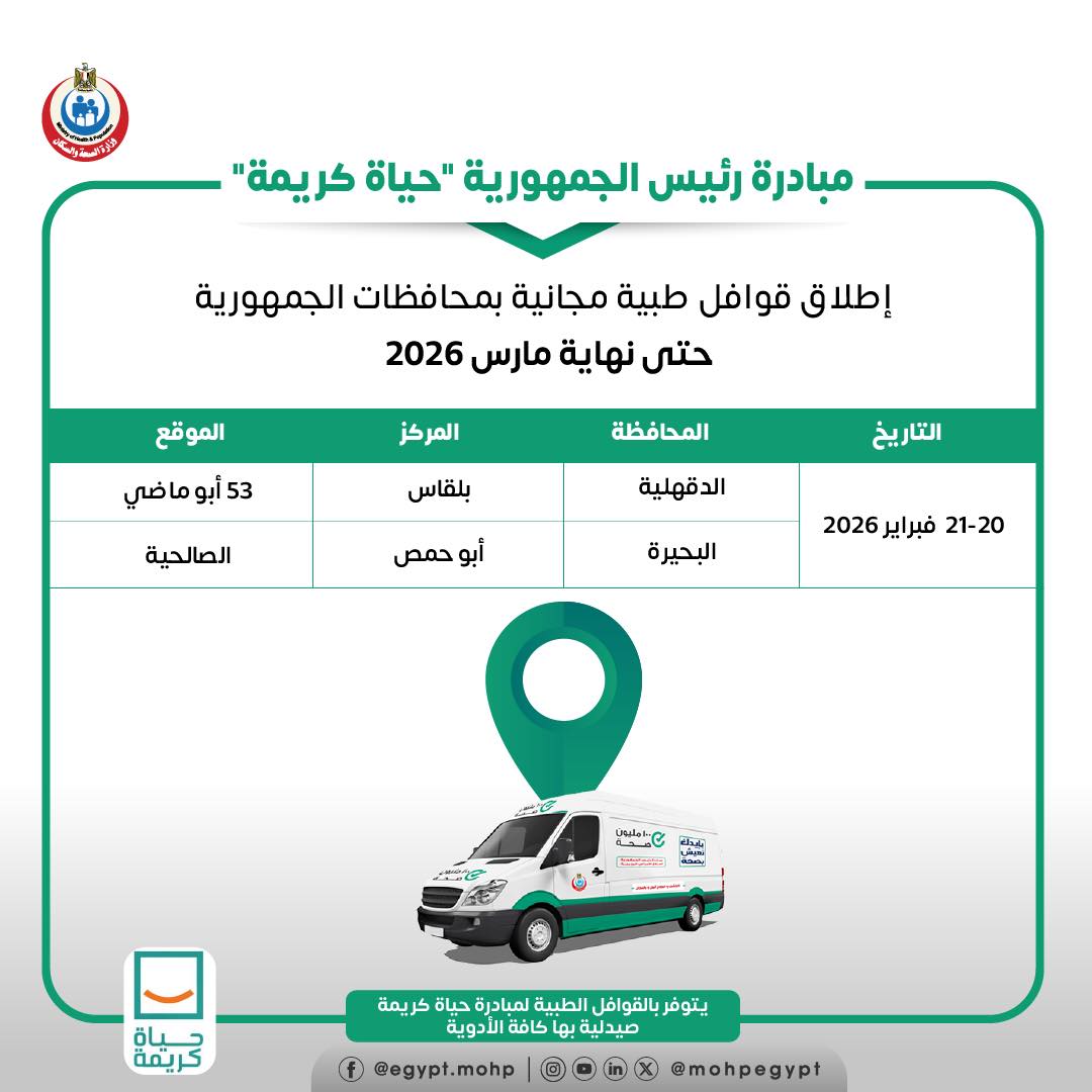 أعلنت وزارة الصحة والسكان ، إطلاق قوافل طبية مجانية بمحافظات الجمهورية حتى نهاية مارس 2026 ضمن مبادرة رئيس الجمهورية حياة كريمة.