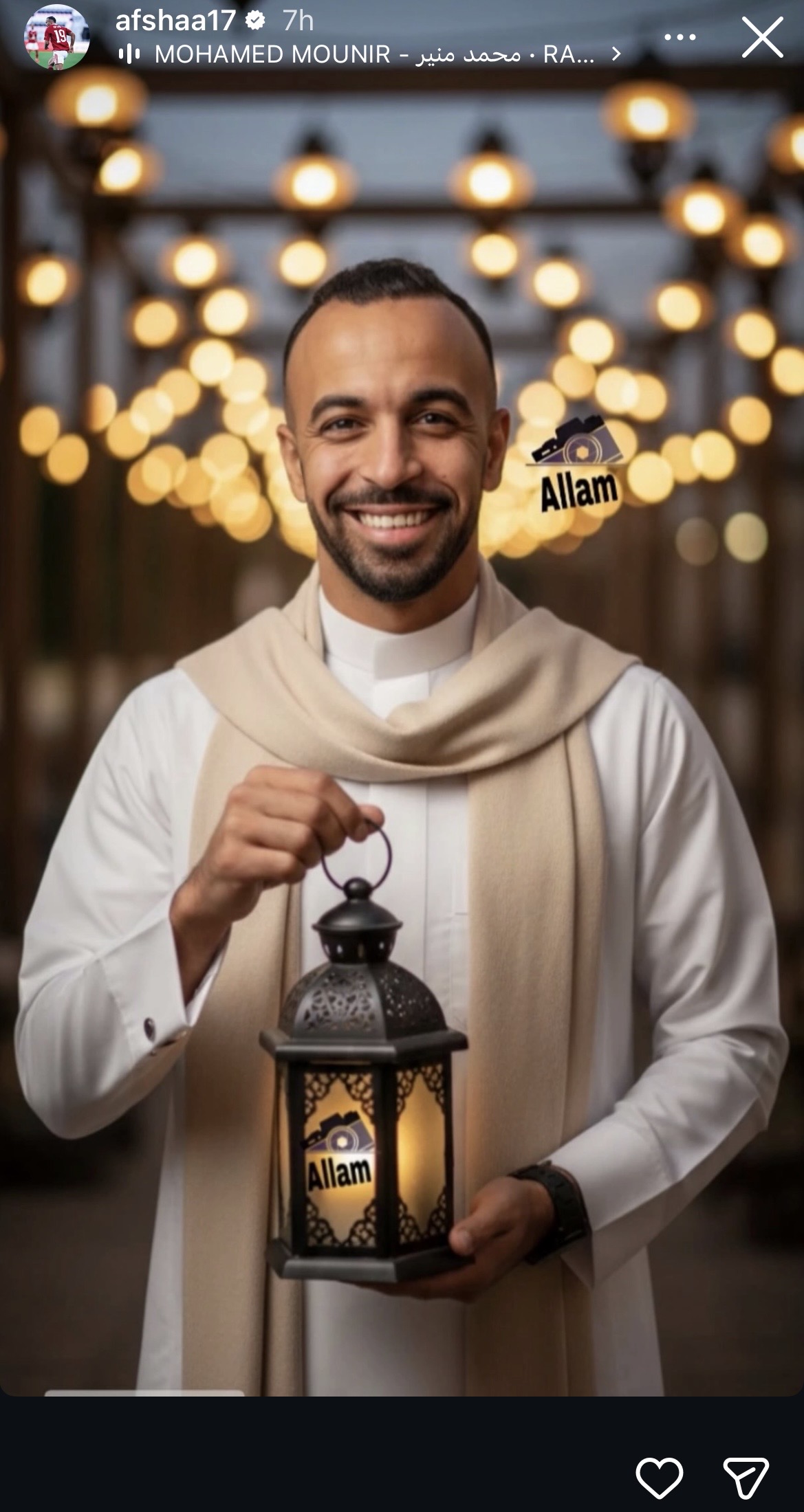 وظهر أفشة عبر خاصية الاستوري حاملا فانوس رمضان، وعلق: “رمضان كريم ”.