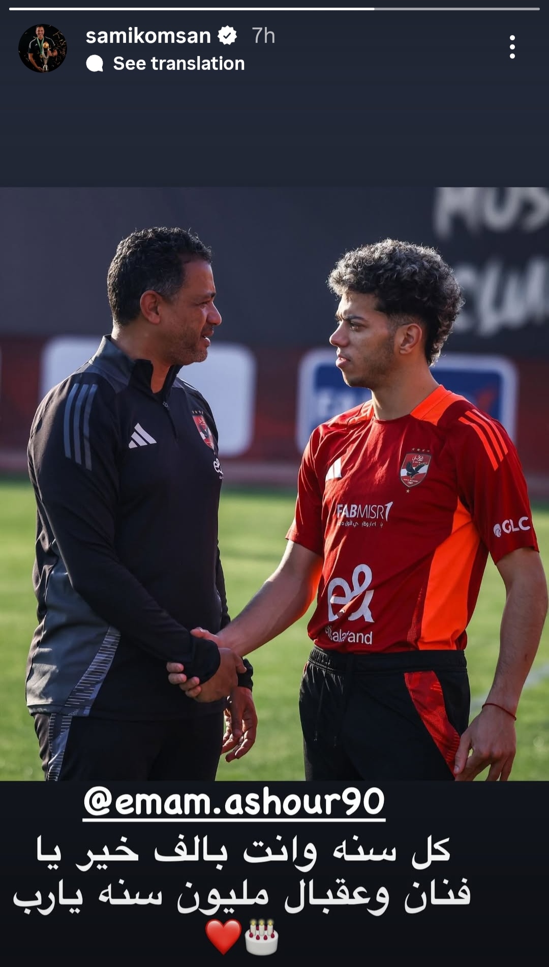 حرص سامي قمصان، المدرب العام السابق في الجهاز الفني للفريق الأول بالنادي الأهلي، علي تهنئة امام عاشور بمناسبة عيد ميلادة عبر حسابه الشخصي بموقع التواصل الإجتماعي إنستجرام .