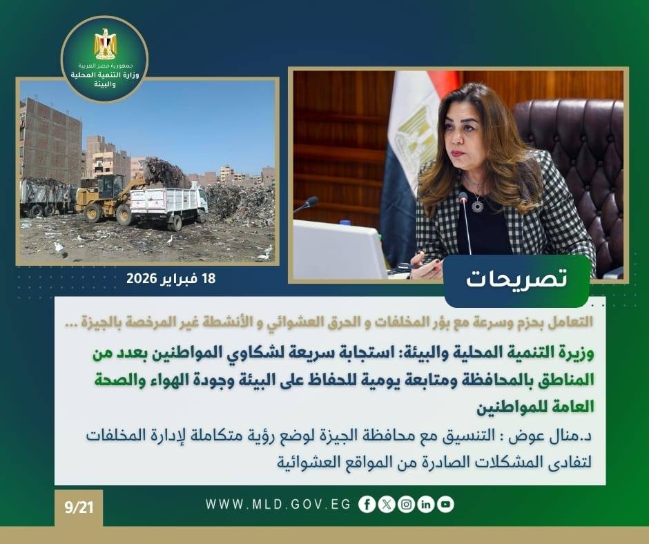 وفي إطار حرص وزارة التنمية المحلية والبيئة لسرعة الاستجابة لشكاوى المواطنين من تراكم المخلفات وإزالة أسبابها والتأكد من عدم تكرارها للحفاظ على الصحة العامة للمواطنين، وجهت الدكتورة منال عوض وزيرة التنمية المحلية والبيئة ، جهاز تنظيم إدارة المخلفات باتخاذ إجراءات سريعة بشأن الشكاوى الواردة بمواقع التواصل الاجتماعي عن تضرر المواطنين من تراكم المخلفات بمنطقة مساكن الصفراء مركز بدر - محافظة البحيرة.