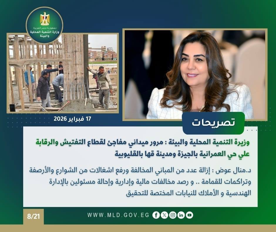 وأعلنت الدكتورة منال عوض وزيرة التنمية المحلية والبيئة، عن قيام لجنة من قطاع التفتيش والرقابة وتقويم الأداء بالمرور الميداني المفاجيء خلال الأسبوع الثاني من شهر فبراير الجاري علي عدد من أحياء محافظتي الجيزة والقليوبية وذلك في إطار النهج الرقابي الصارم الذي تتبناه الوزارة لضمان انضباط منظومة العمل المحلي والارتقاء بجودة الخدمات المقدمة للمواطنين.