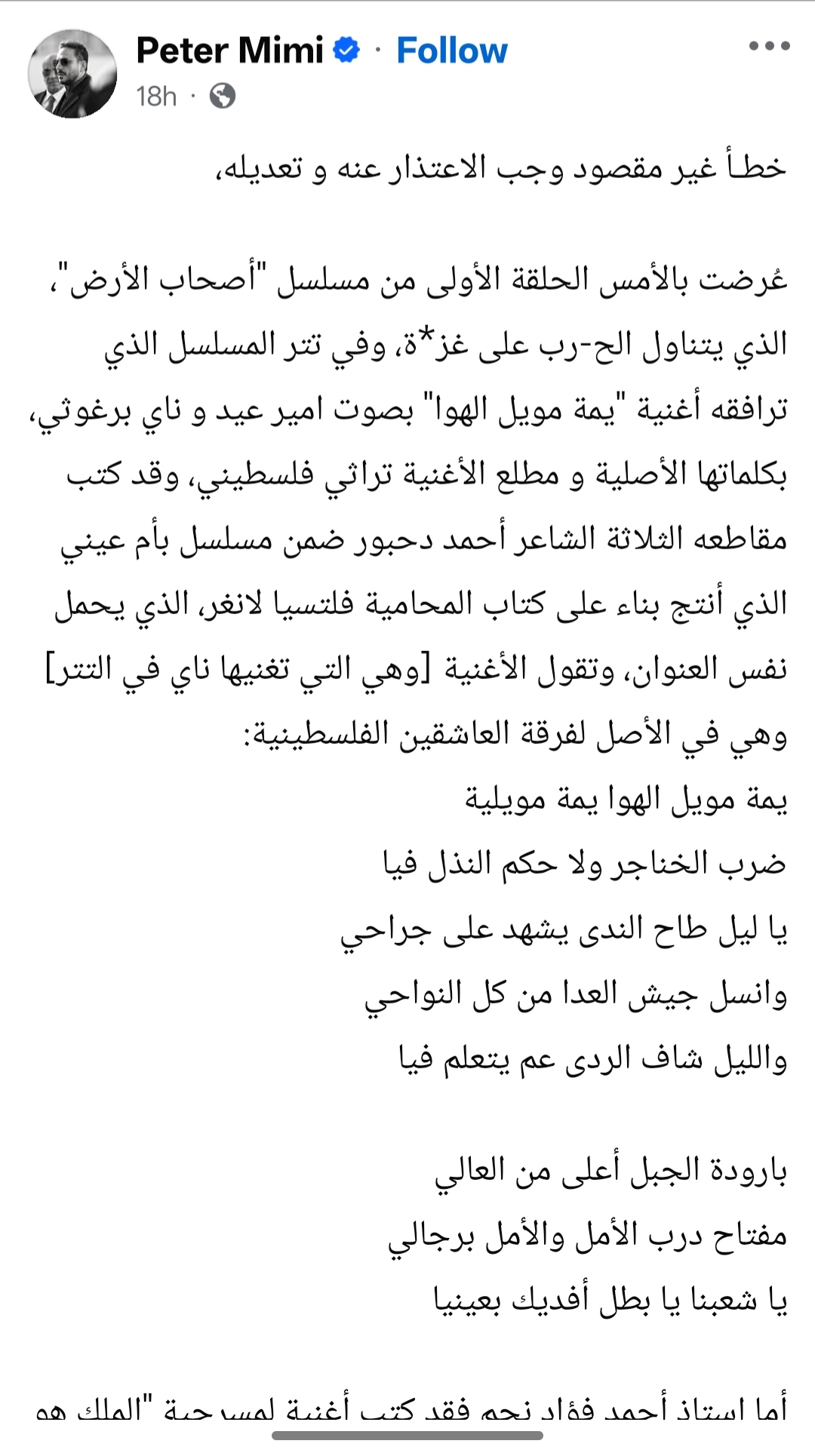 وكتب ميمي، عبر حسابه بموقع فيسبوك تحت عنوان" خطأ غير مقصود وجب الإعتذار عنه وتعديله"، قائلا: "بعد عرض الحلقة الأولى من مسلسل أصحاب الأرض، الذي يتناول الحرب على غزة، وفي تتر المسلسل الذي ترافقه أغنية "يمة مويل الهوا" بصوت أمير عيد وناي برغوثي، بكلماتها الأصلية ومطلع الأغنية تراثي فلسطيني، وقد كتب مقاطعه الثلاثة الشاعر أحمد دحبور ضمن مسلسل "بأم عيني" الذي أنتج بناء على كتاب المحامية فلتسيا لانغر، الذي يحمل نفس العنوان، وتقول الأغنية [وهي التي تغنيها ناي في التتر] وهي في الأصل لفرقة العاشقين الفلسطينية: يمة مويل الهوا يمة مويلية.. ضرب الخناجر ولا حكم النذل فيا.. يا ليل طاح الندى يشهد على جراحي".