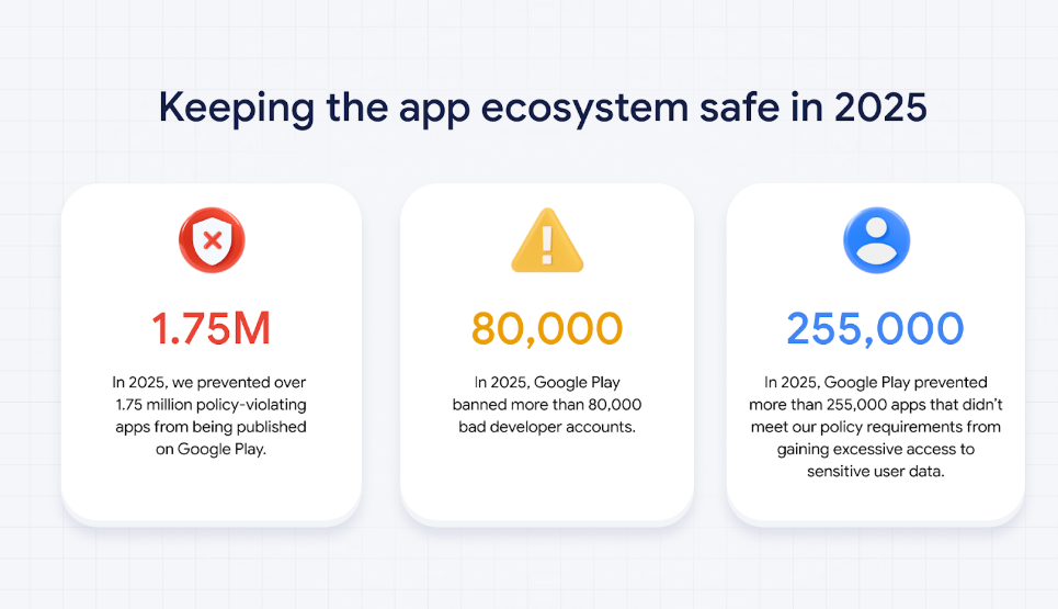 وذكرت جوجل أنها حظرت أكثر من 80 ألف حساب مطور خلال 2025 لمحاولتهم نشر تطبيقات ضارة، وهو رقم أقل مقارنة بـ 158 ألف حساب في 2024 و333 ألف حساب في 2023.