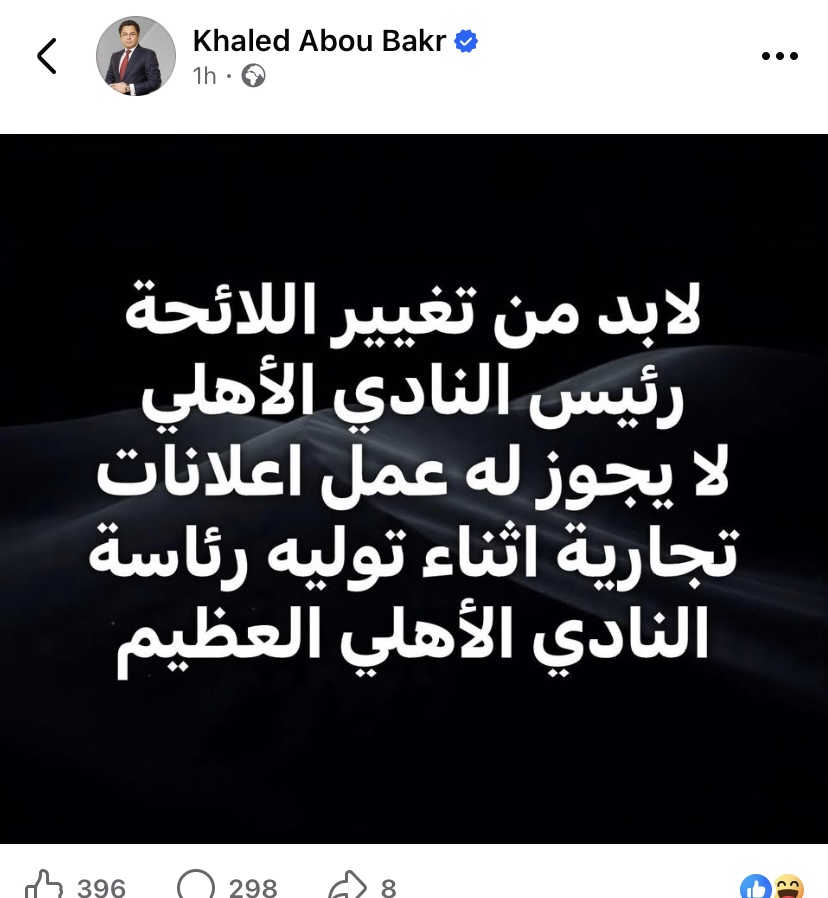 وقال أبو بكر، خلال حسابه بموقع التواصل الإجتماعي فيسبوك :"لابد من تغيير اللائحة، رئيس النادى الأهلى لا يجوز له عمل إعلانات تجارية أثناء توليه رئاسة النادى الأهلى العظيم".