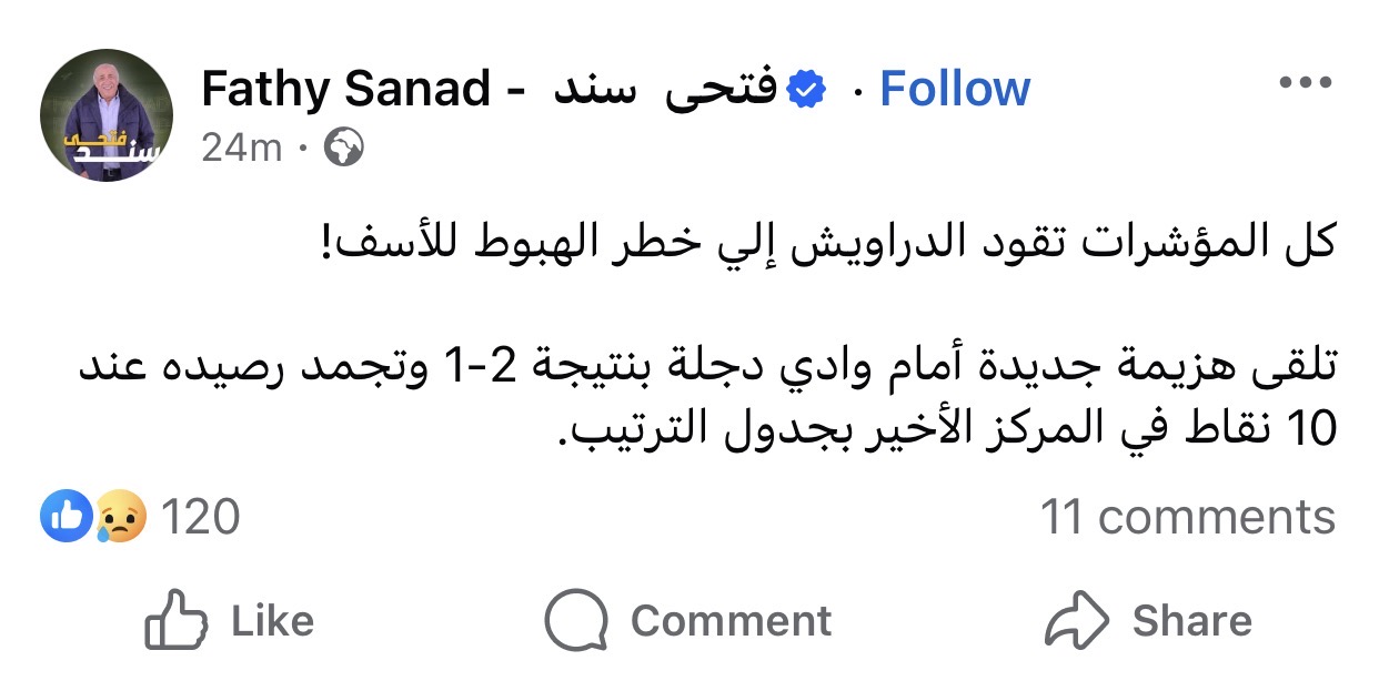 وكتب فتحي سند عبر حسابه: “كل المؤشرات تقود الدراويش إلى خطر الهبوط للأسف!”، وذلك عقب الهزيمة الجديدة التي تلقاها الفريق أمام وادي دجلة بنتيجة 2-1