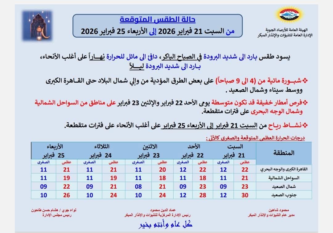 كشفت الهيئة العامة للأرصاد الجوية، عن تفاصيل حالة الطقس اليوم السبت الموافق 21 فبراير 2026، ثالث أيام شهر رمضان المبارك، حيث من المتوقع أن يسود طقس متباين على معظم أنحاء البلاد بين البرودة في الصباح والليل وارتفاع الحرارة بشكل معتدل نهارًا.
