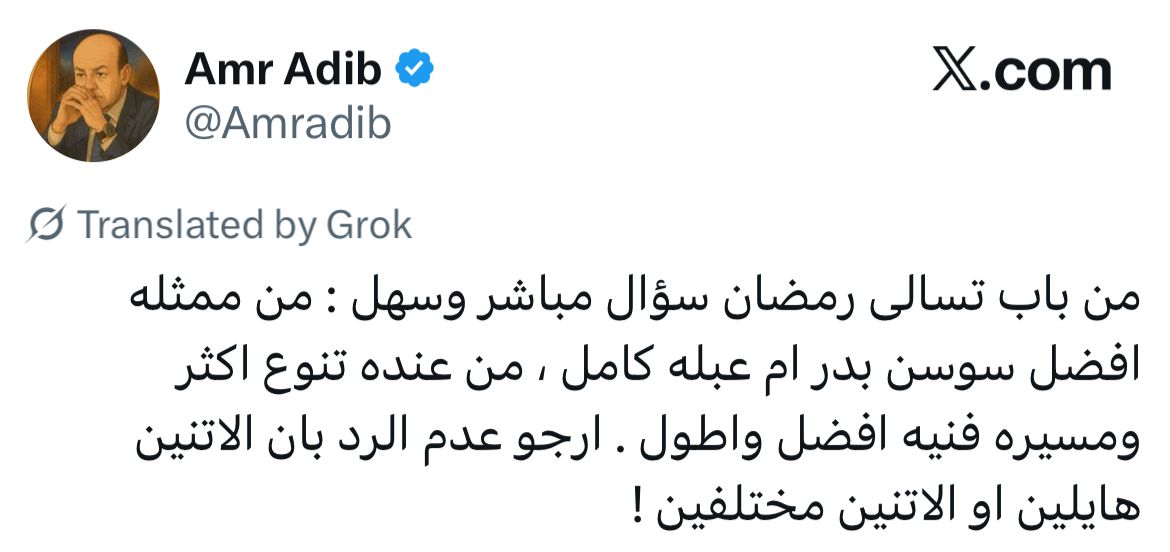 وكتب عمرو أديب عبر حسابه على إكس: "من باب تسالى رمضان سؤال مباشر وسهل من ممثله افضل سوسن بدر ام عبله كامل، من عنده تنوع اكثر ومسيره فنيه افضل واطول. ارجو عدم الرد بان الاتنين هايلين او الاتنين مختلفين !".