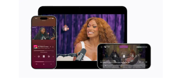 تطبيق البودكاست أصبح يدعم التنقل السلس بين الحلقات الصوتية والفيديو، باستخدام HTTP Live Streaming (HLS)، يمكن للمستمعين مشاهدة الفيديو أو الاستماع للصوت في نفس الحلقة، مع خيار الانتقال لشاشة كاملة أفقية.