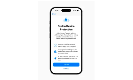 ميزة حماية الأجهزة المسروقة أصبحت مفعلة افتراضيا، مع إضافة طبقة إضافية من المصادقة البيومترية (Face ID أو Touch ID) للوصول إلى كلمات المرور أو إجراء تغييرات حساسة على الحساب.