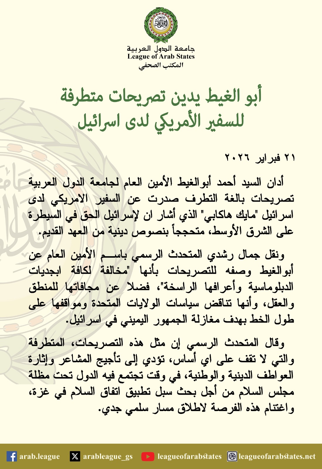 أدان الأمين العام لجامعة الدول العربية، أحمد أبو الغيط، تصريحات أدلى بها السفير الأمريكي لدى إسرائيل، وُصفت بأنها تنطوي على لغة تطرف، بعدما أشار إلى أحقية إسرائيل في السيطرة على الشرق الأوسط، مستندًا إلى نصوص دينية من العهد القديم.