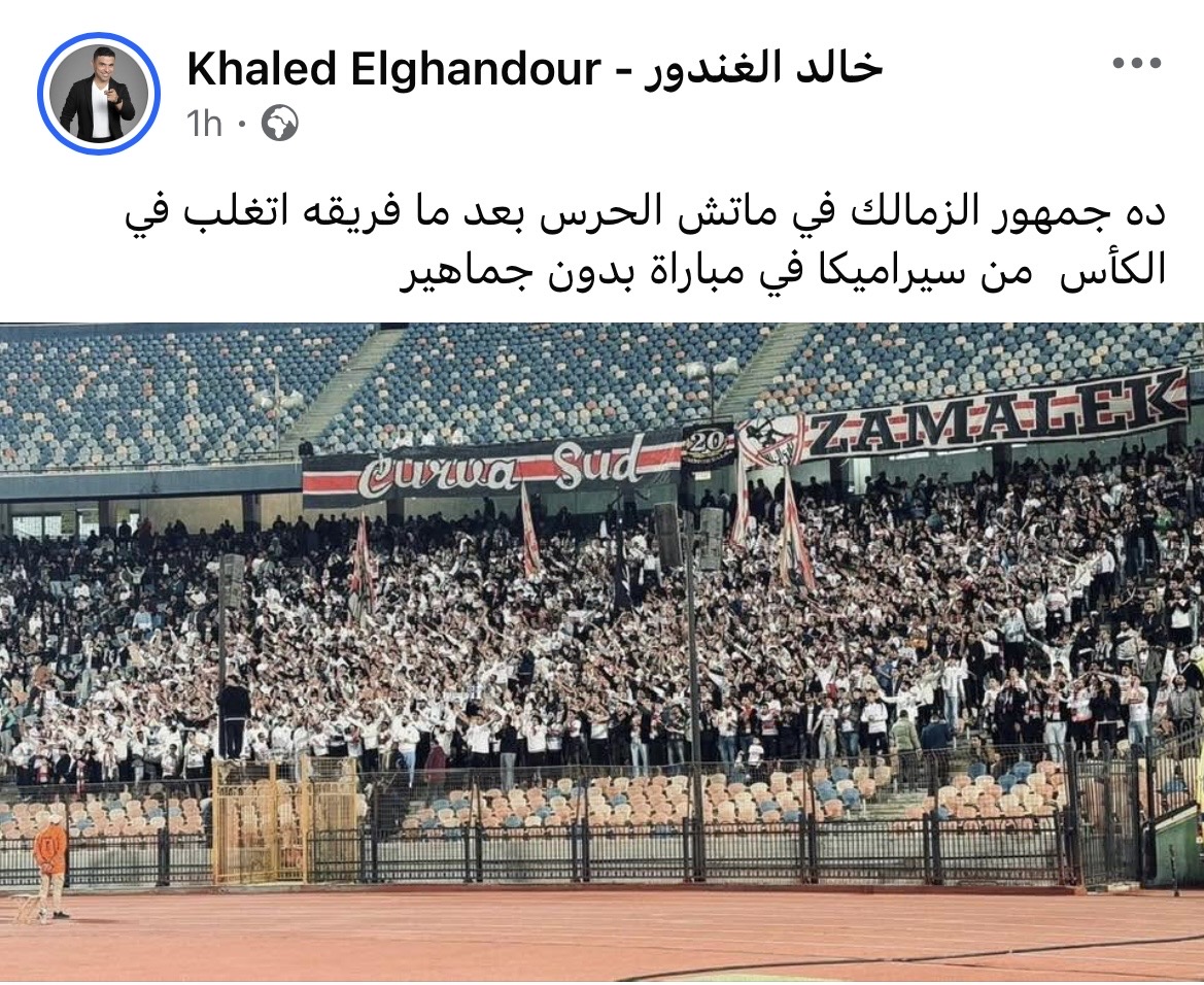 وكتب الغندور عبر حسابه على فيسبوك: “ده جمهور الزمالك في ماتش الحرس بعد ما فريقه اتغلب في الكأس من سيراميكا في مباراة بدون جماهير”.