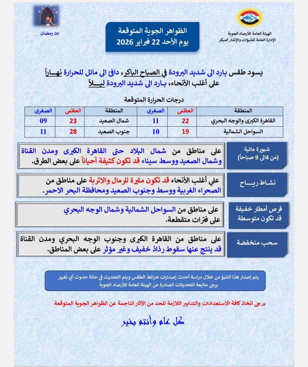 وأفاد الهيئة، أن طقس اليوم الأحد سيشهد شبورة من 4 إلى 9 صباحاً على مناطق من شمال البلاد حتى القاهرة الكبرى ومدن القناة وشمال الصعيد ووسط سيناء قد تكون كثيفة أحياناص على بعض الطرق.